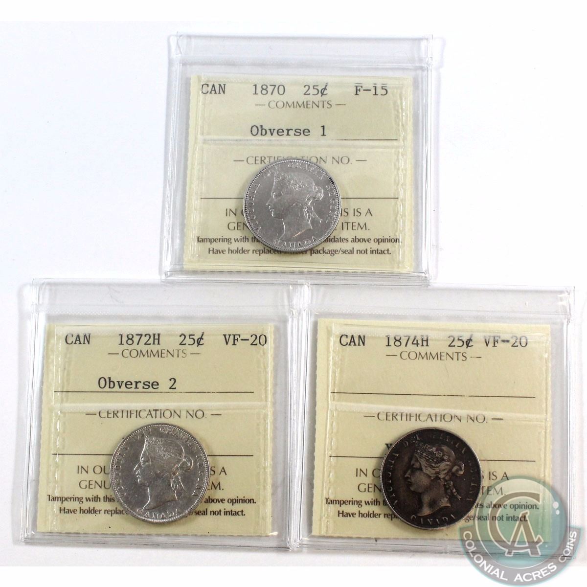 25-cent 1870 Obv. 1 F-15, 1872H Obv. 2 VF-20, & 1874H VF-20 ICCS Certified. 3pcs.