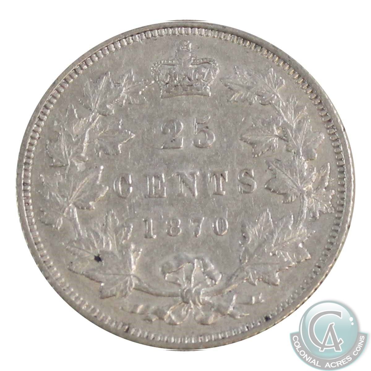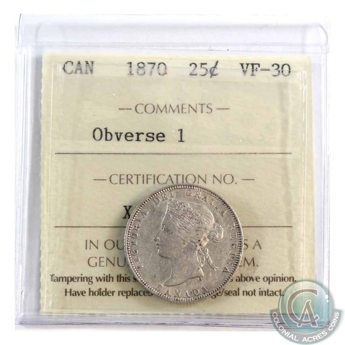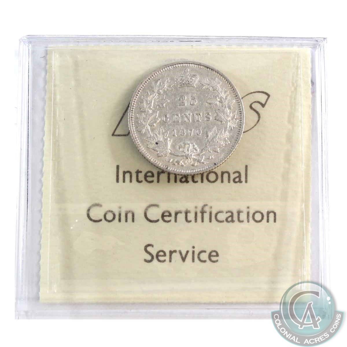 25-cent 1870 Obv.1, ICCS Certified VF-30. A Nice bright problem free midgrade coin.
