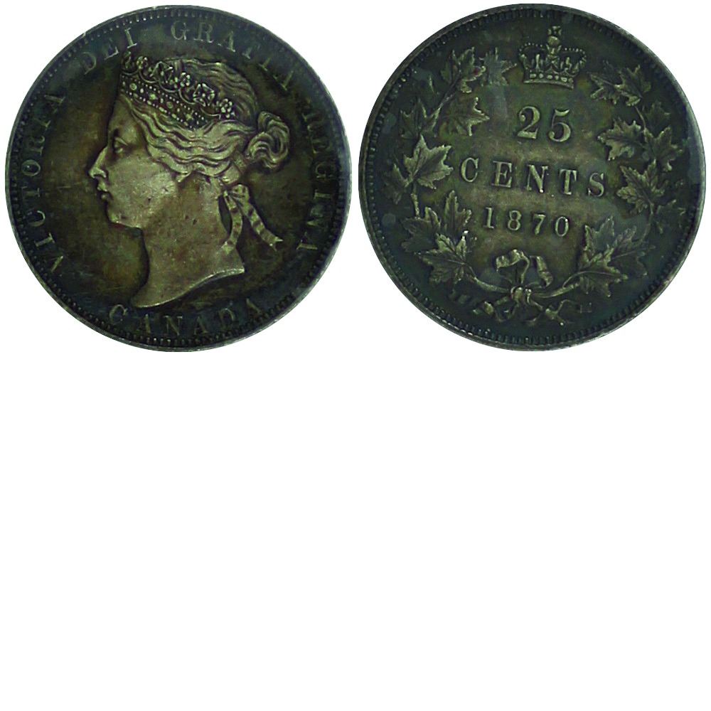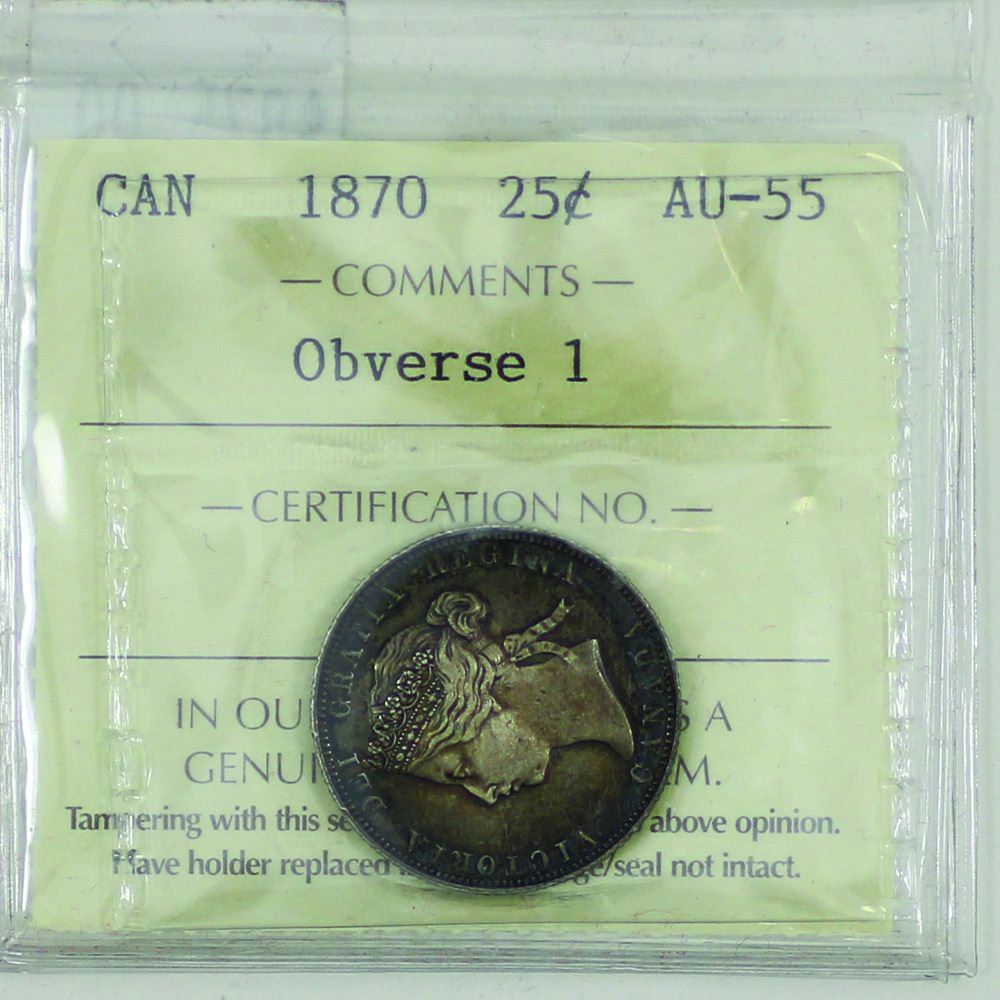 25-cent 1870 Obverse 1, ICCS Certified AU-55. An attractively toned coin with lighter center and darker edges.