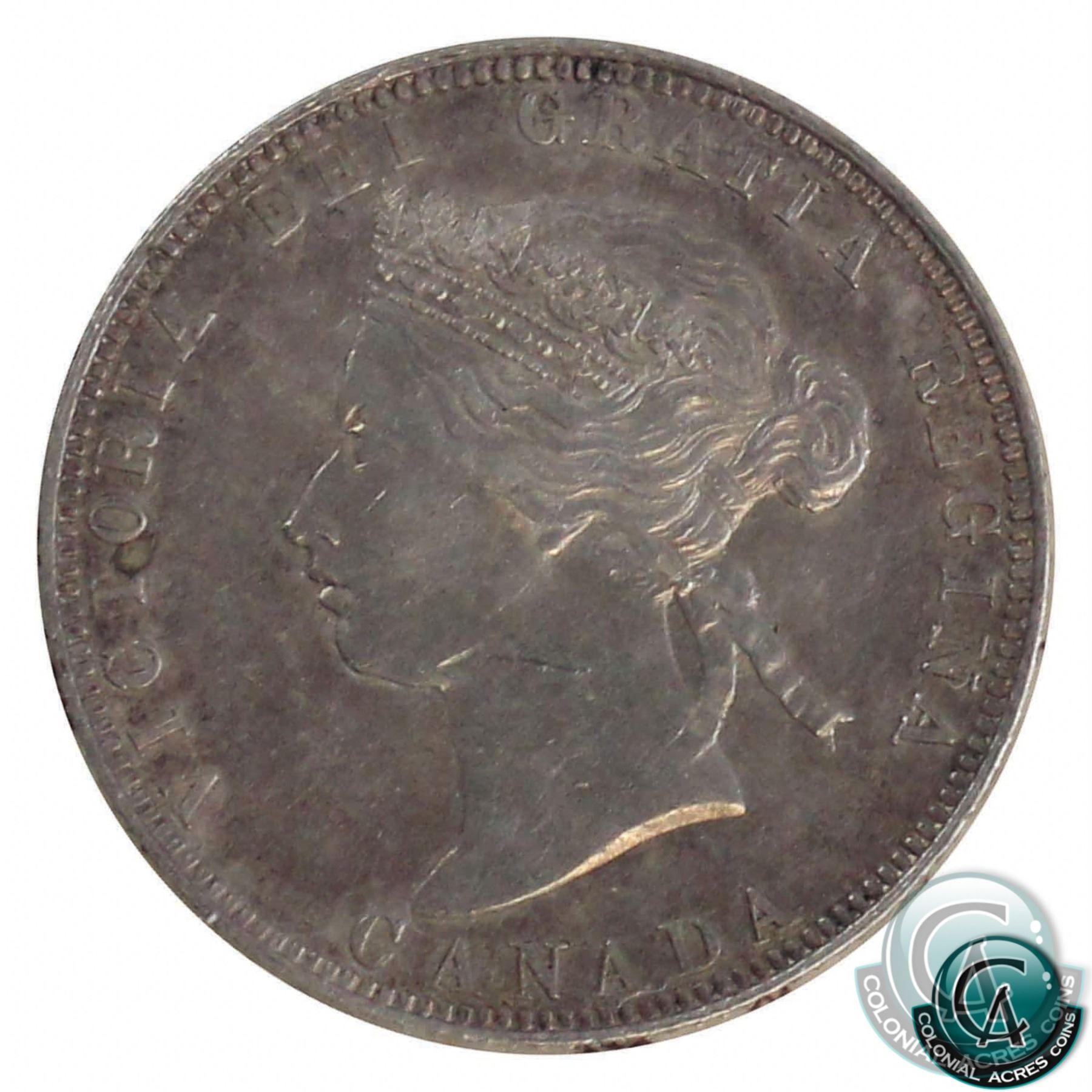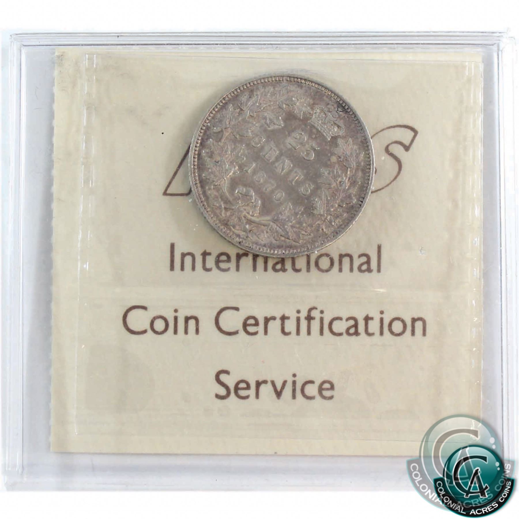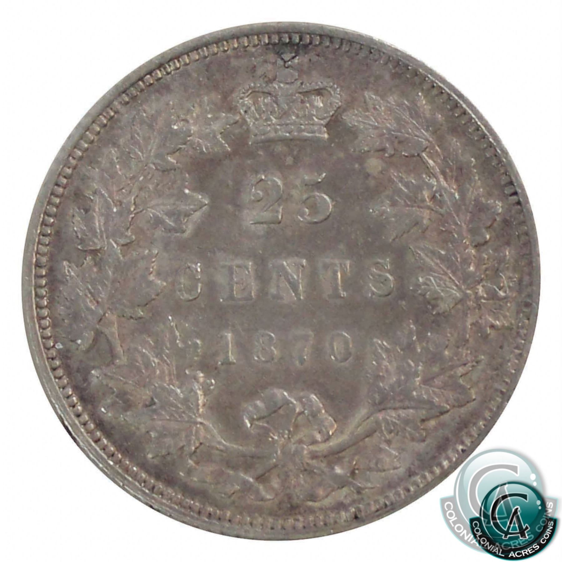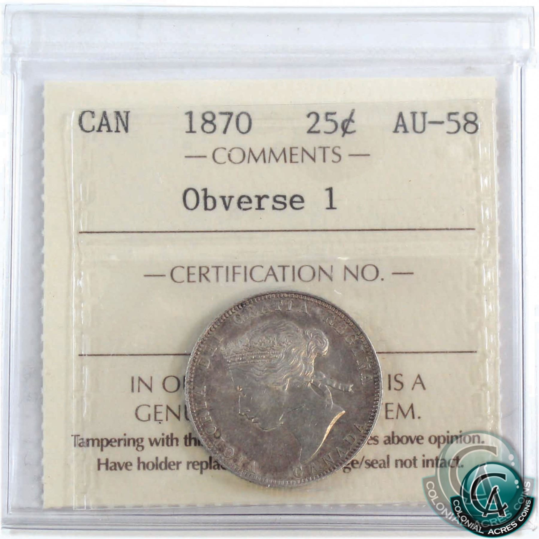 25-cent 1870 Obverse 1 ICCS Certified AU-58. A well struck coin with a light patina with lots of underlying lustre.