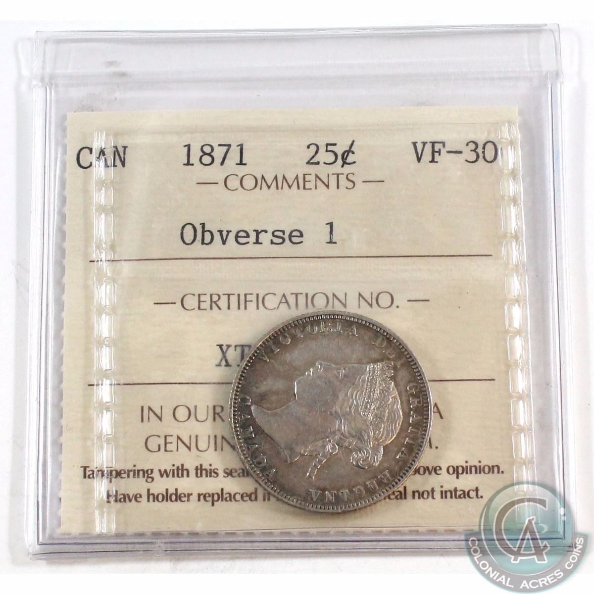 25-cent 1871 Obverse 1 ICCS Certified VF-30. Nice evenly toned coin with hints of rainbow toning.