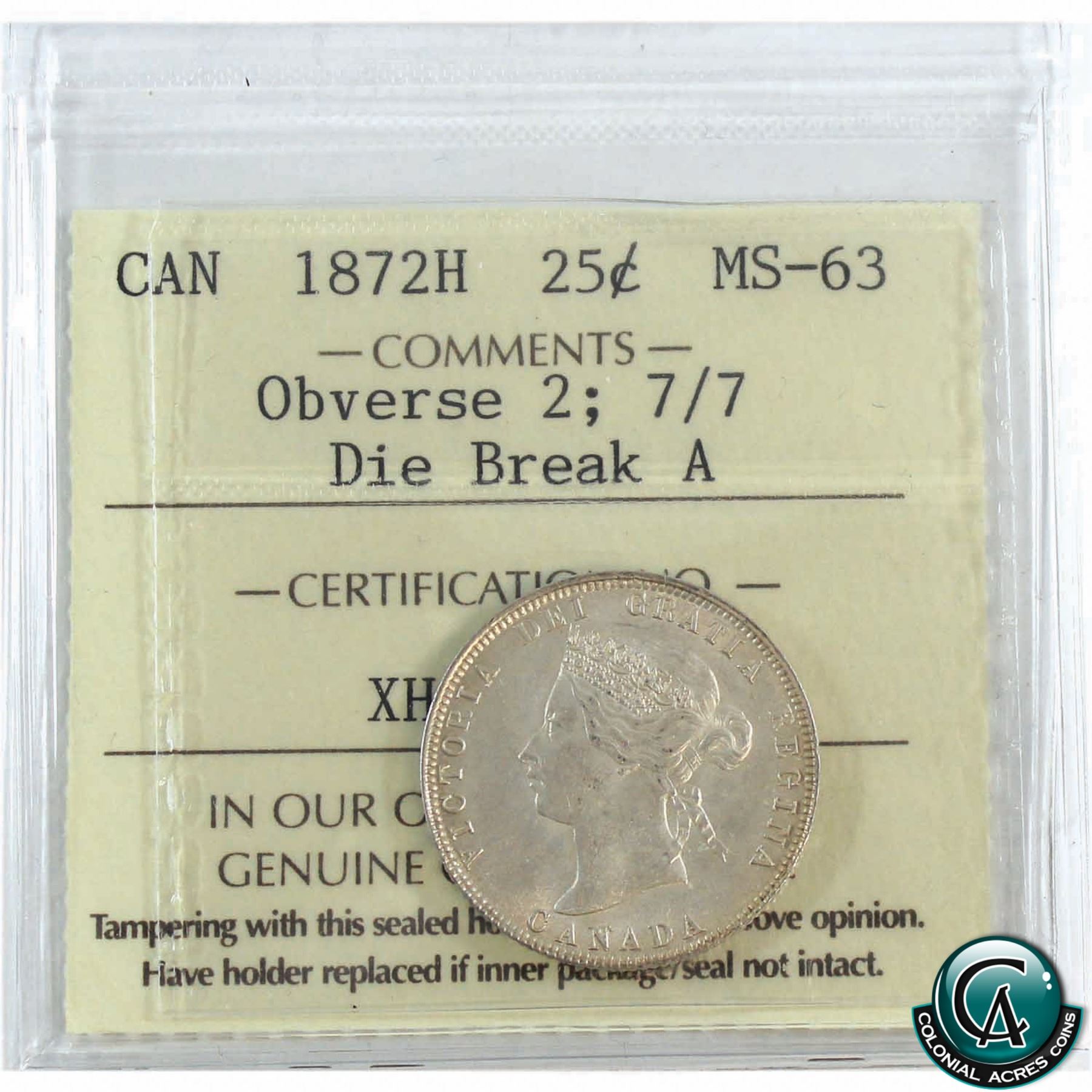 A rare find, with great eye appeal. This coin has exceptional strike details with light satin-like fields. This coin has the 7 over 7 variety on the reverse, as well as the die break inverted "A" on the Spelling of "VICTORIA" on the Obverse. It should be noted that there is more doubling on the obverse with several letters. This coin is worth a close look and a Premium Bid!