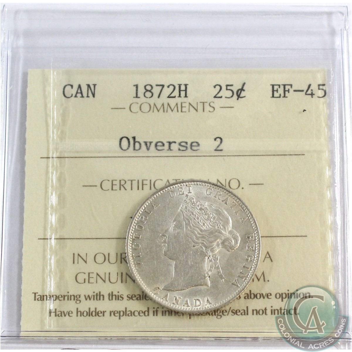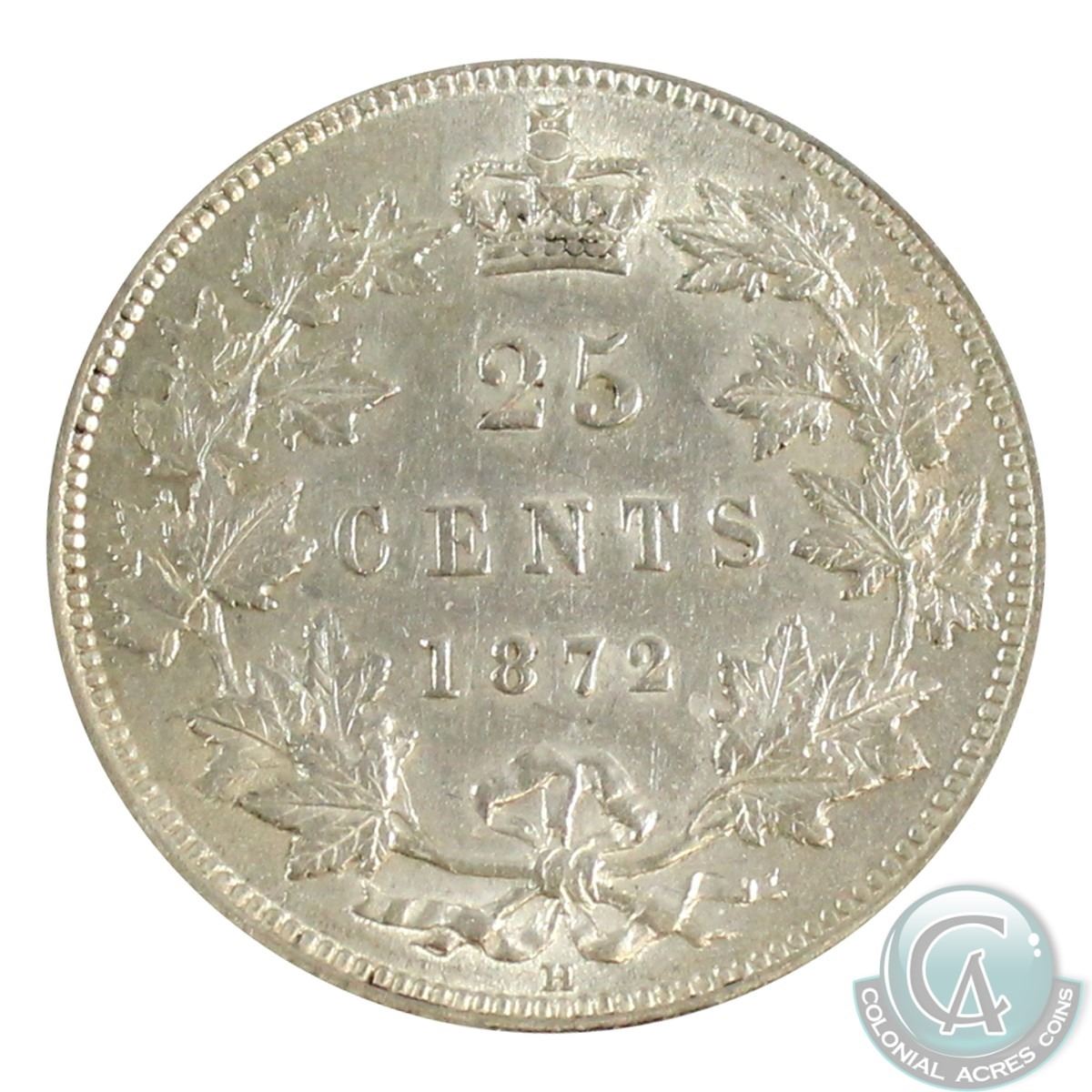 25-cent 1872H Obv.2 ICCS Certified EF-45. Plenty of Mint Luster throughout the borders.