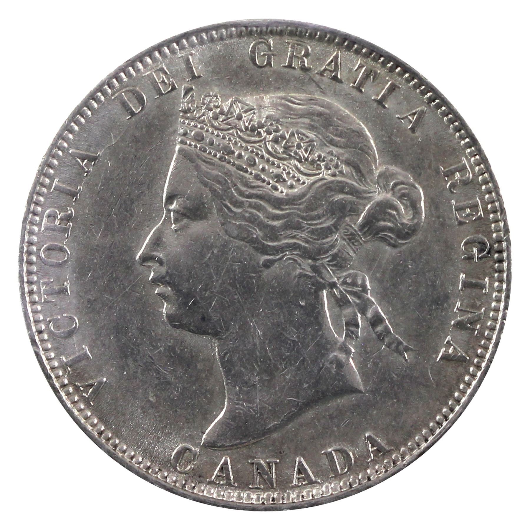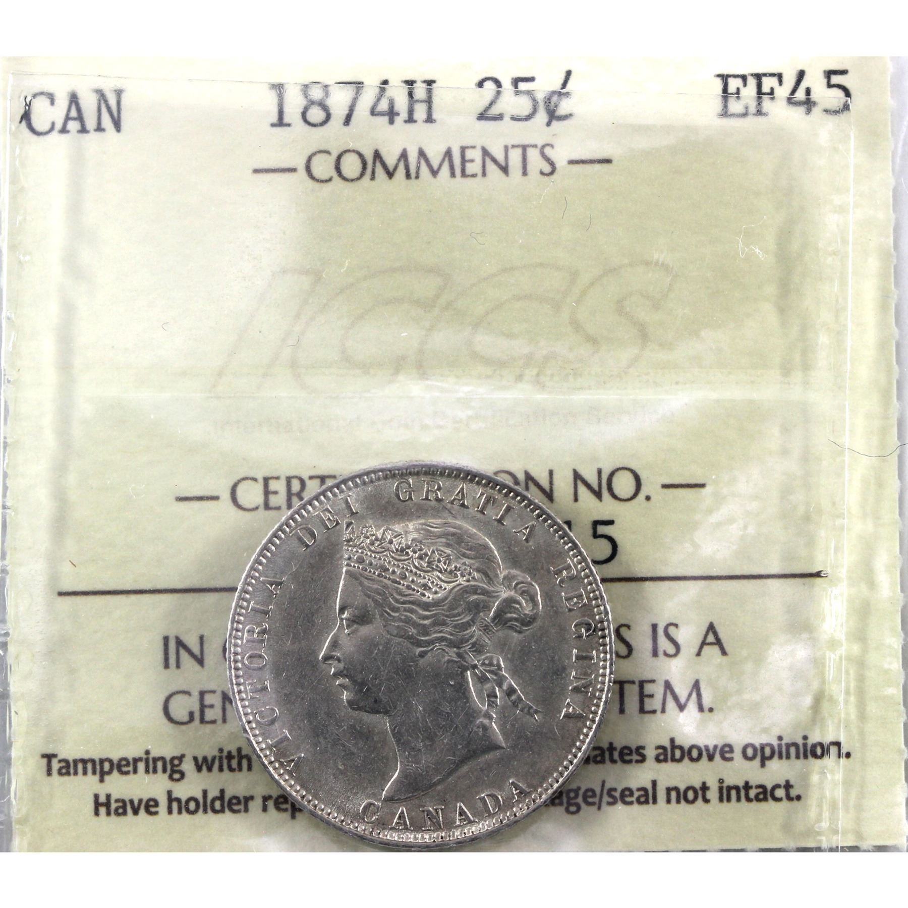 25-cent 1874H ICCS Certified EF-45. A bright attractive coin with mint luster throughout the margins.
