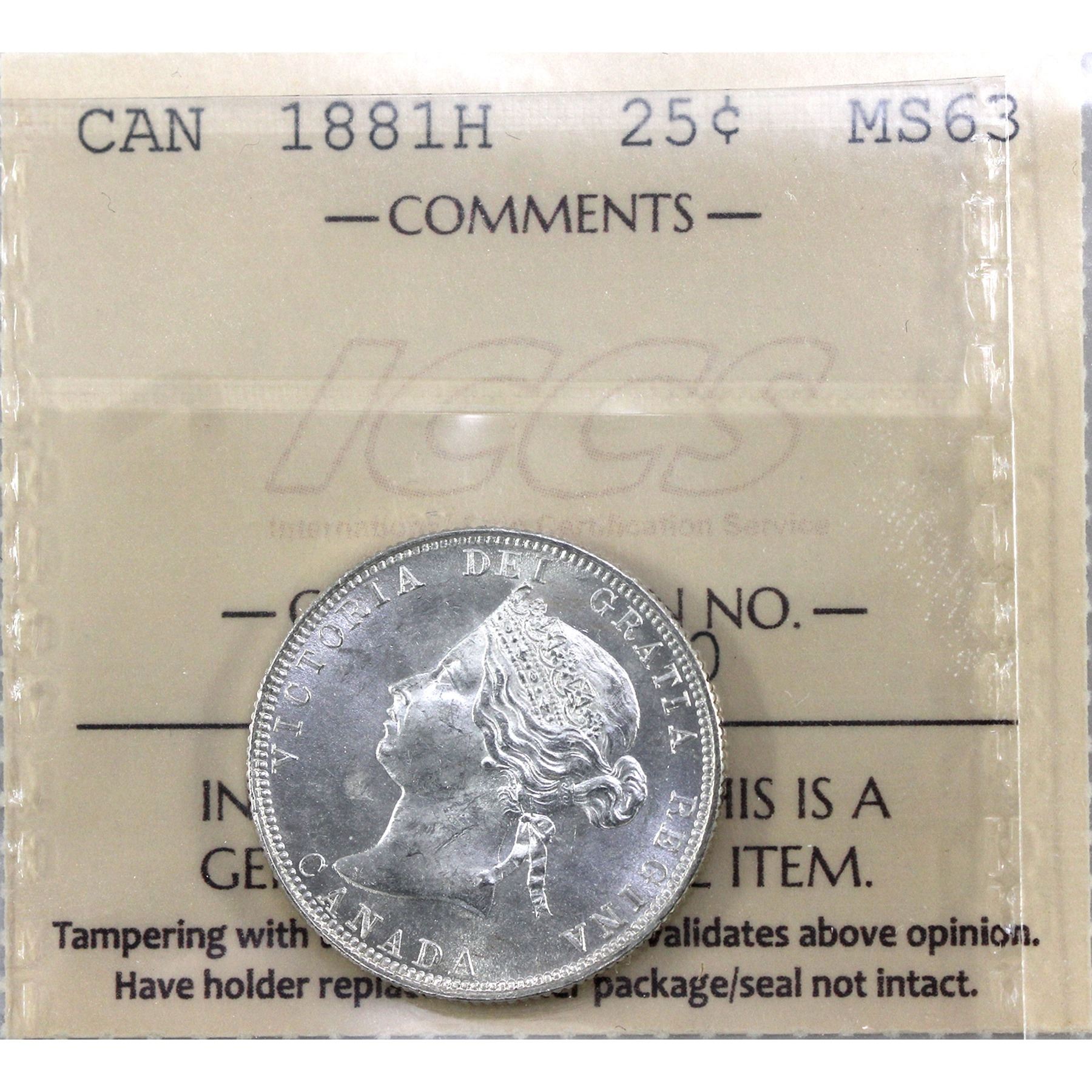 25-cent 1881H ICCS MS63. Beautiful Highly Lustrous Blast White Coin. Rare in high mint state