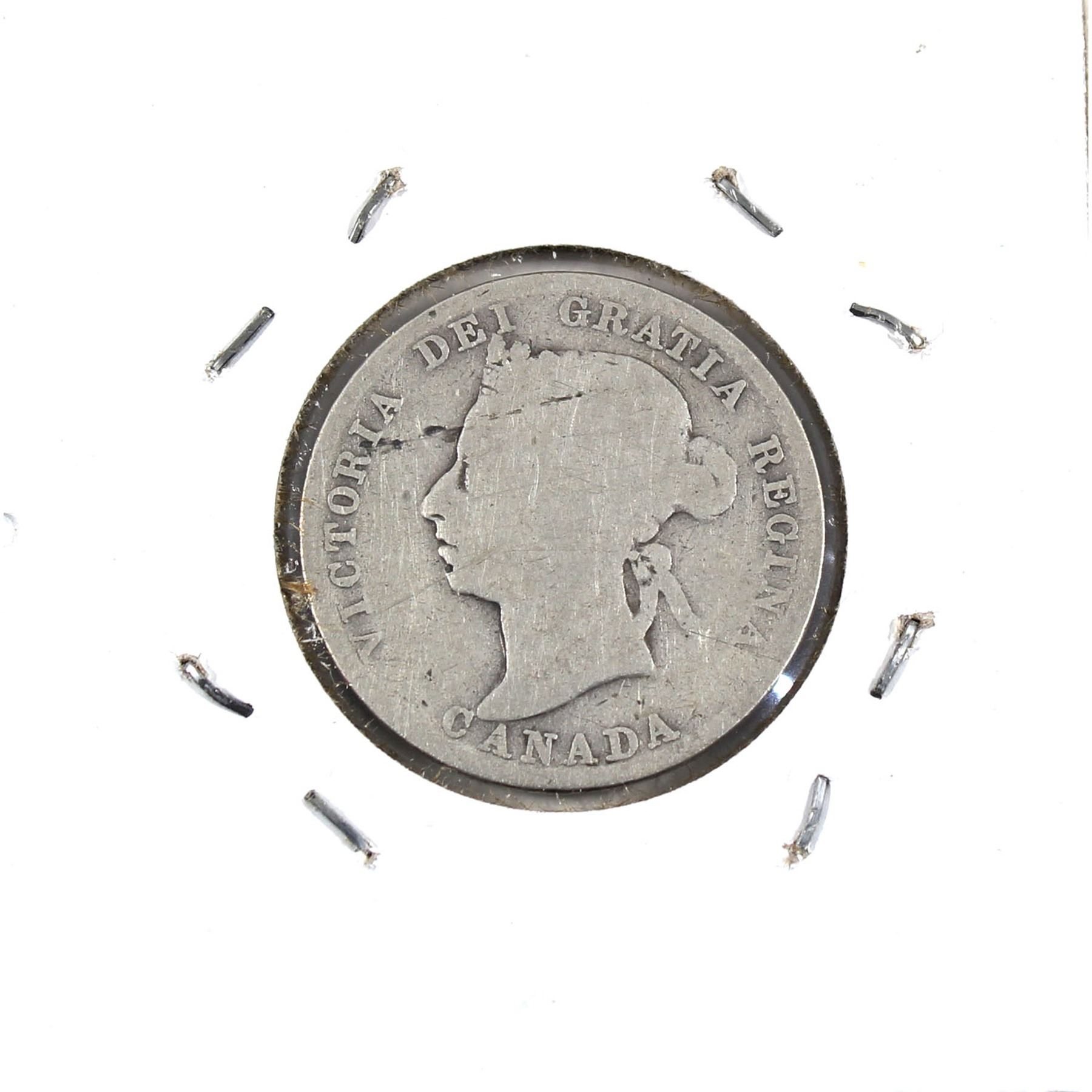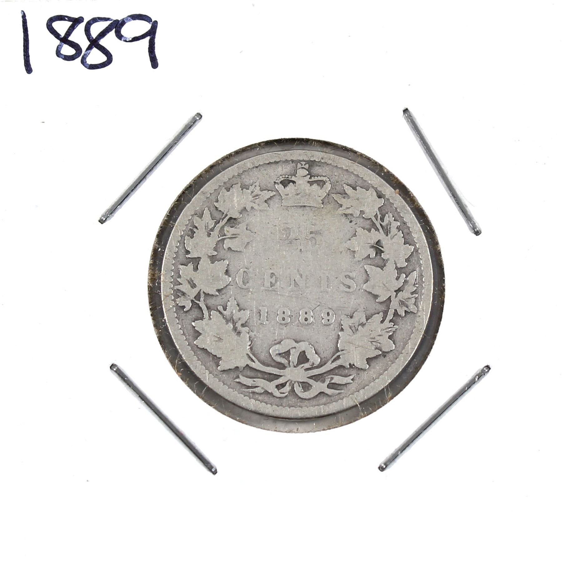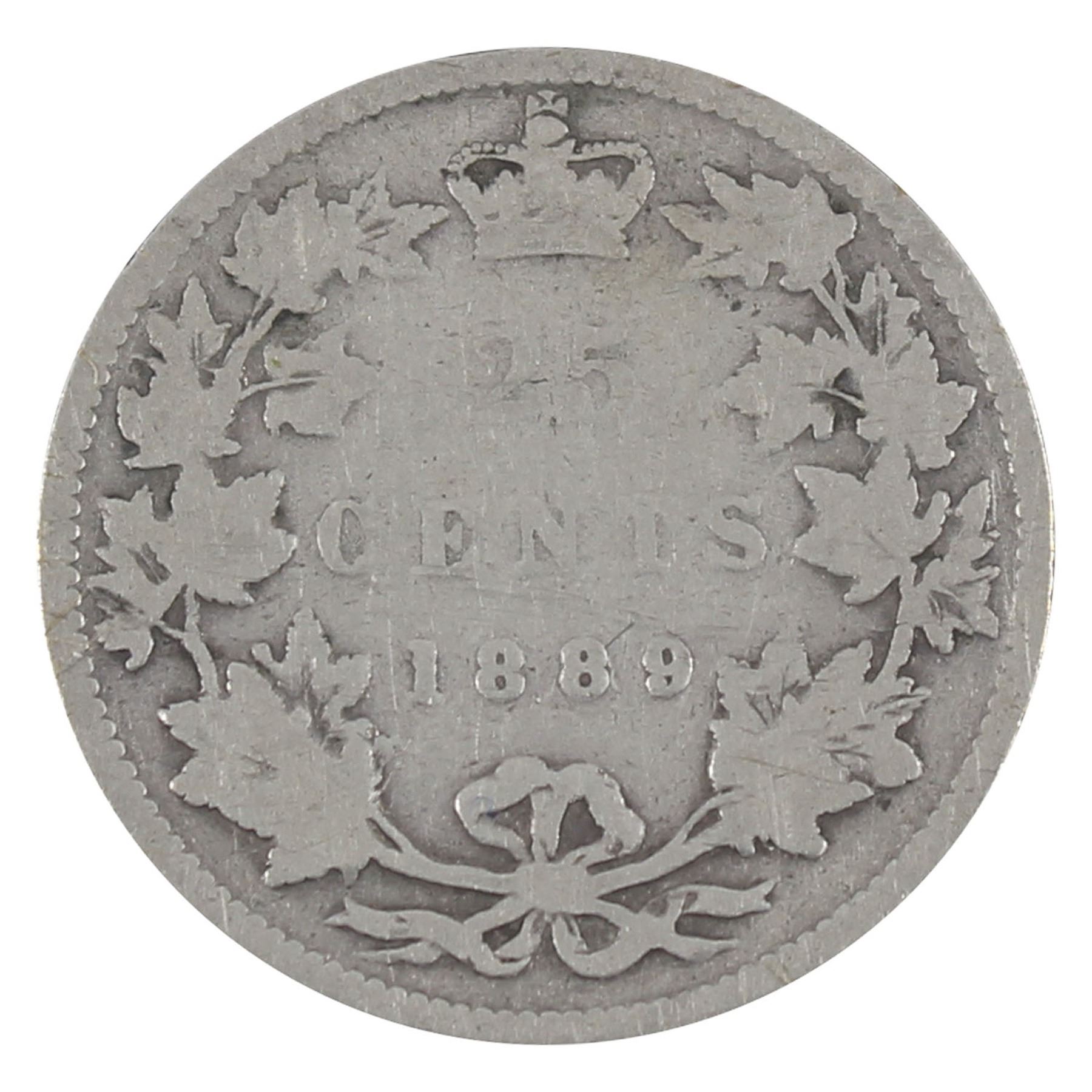 25-cent 1889 Closed 9 in G-4 condition (small scratches) coin has full date and lettering.