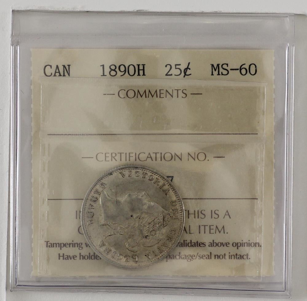 25-cent 1890H ICCS Certified MS60. An exceptional coin with lots of rolling luster. Coin is has bright fields accented with subtle hints of Golden.