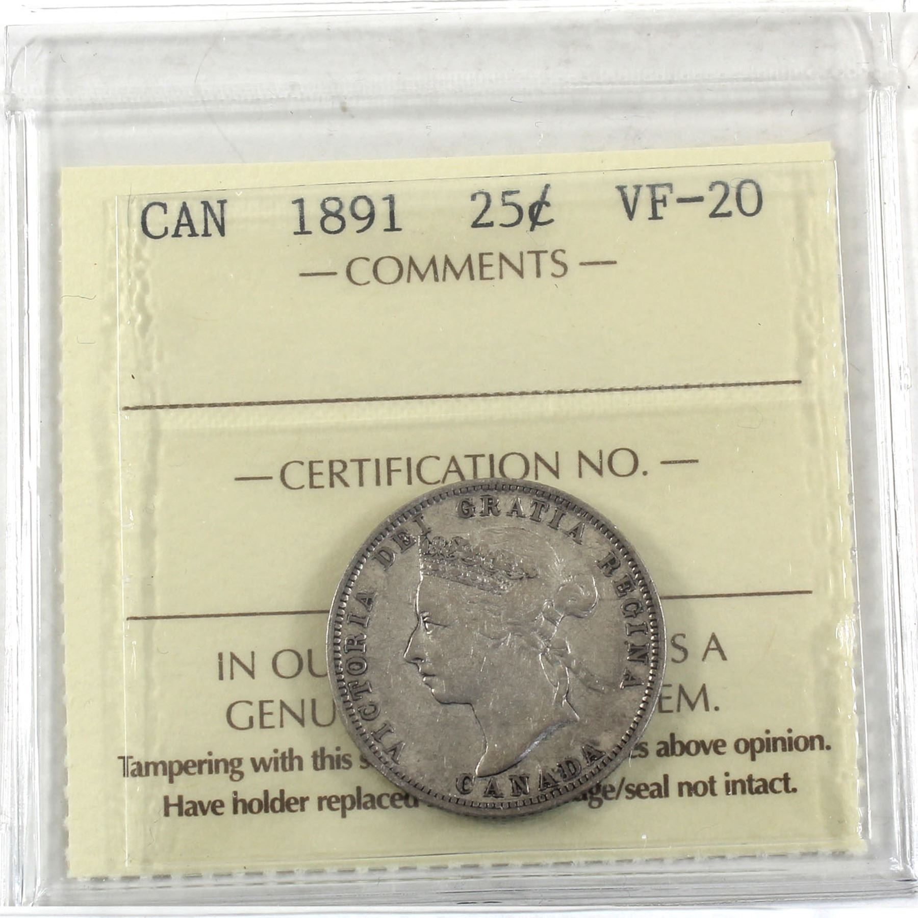 25-cent 1891 ICCS Certified VF-20. *Key Date*
