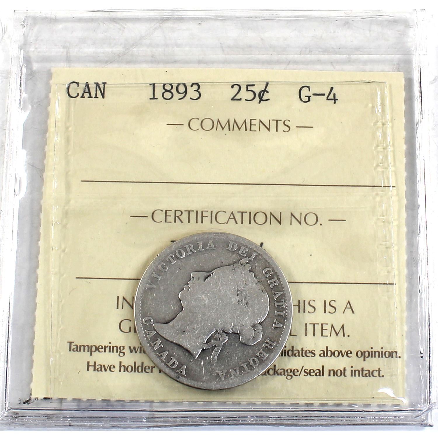 25-cent 1893 ICCS Certified G-4 *Key Date* Full date and full lettering on both obverse and reverse.