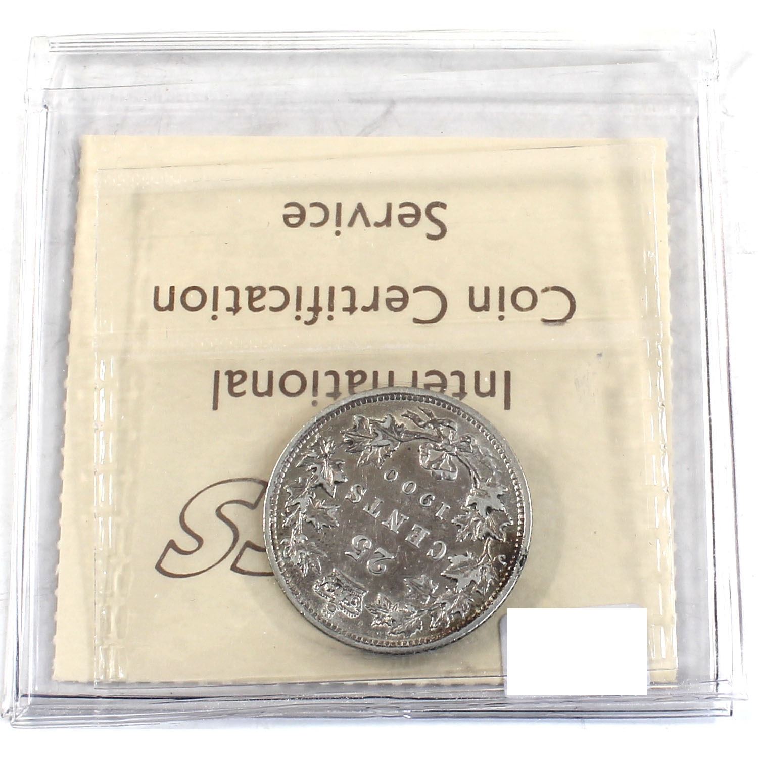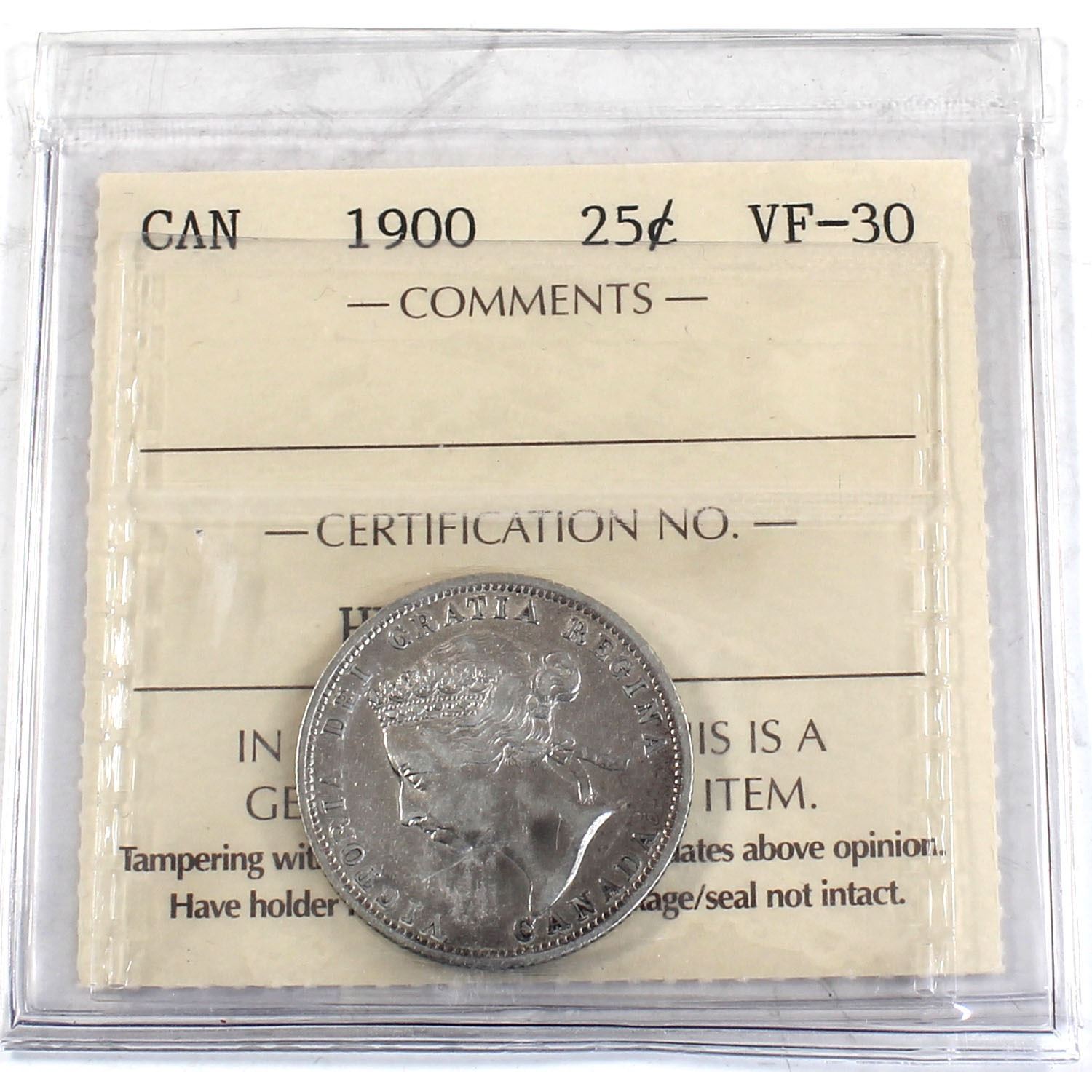 25-cent 1900 ICCS Certified VF-30. Bright coin throughout.