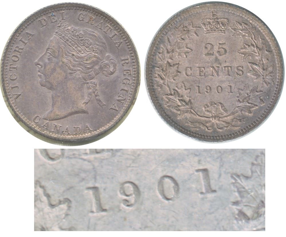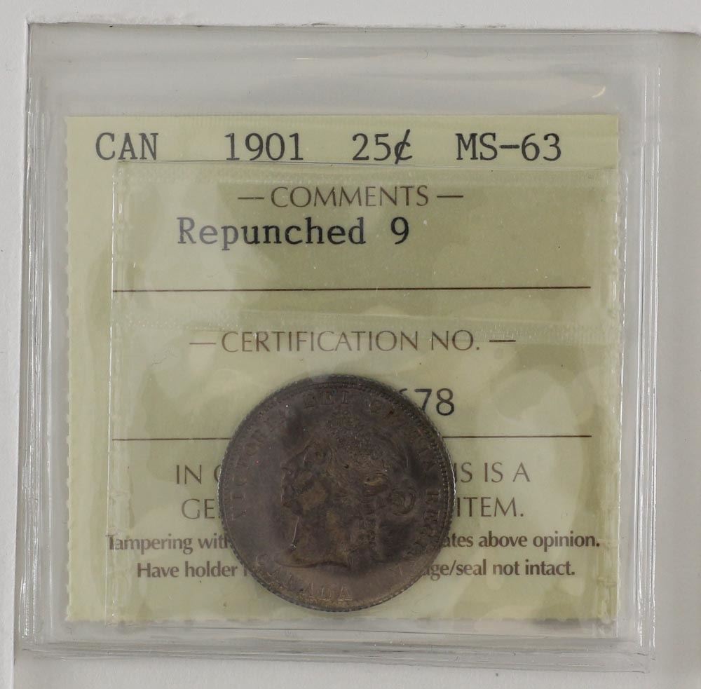 25-cent 1901 Repunched 9 Variety ICCS MS63. Amazing rustic toning.