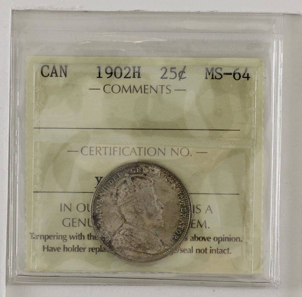 25-cent 1902H ICCS Certified MS64. Coin is lightly toned with hints of olive green and indigo blues.