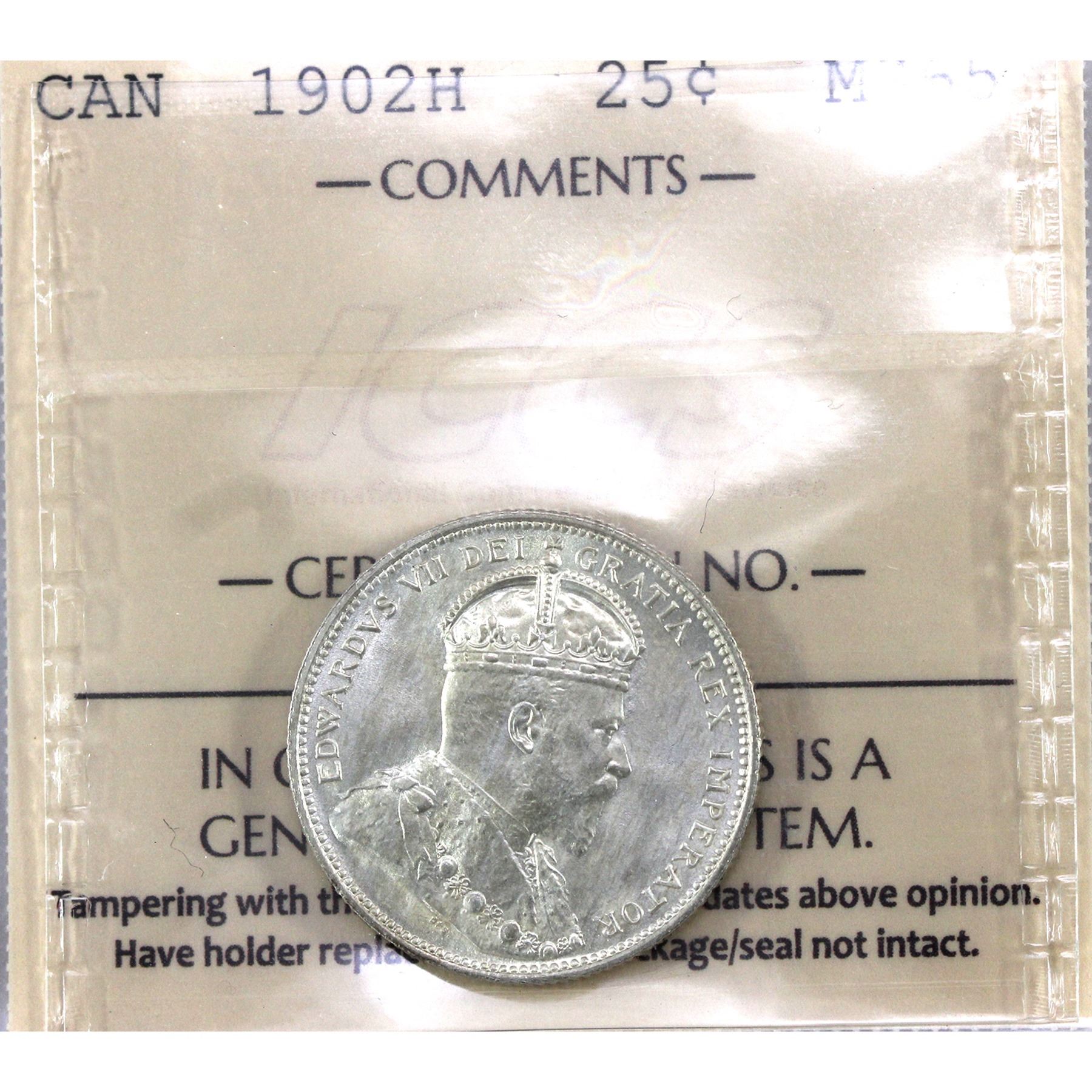 25-cent 1902H ICCS MS65. Bright white coin with light golden hues.