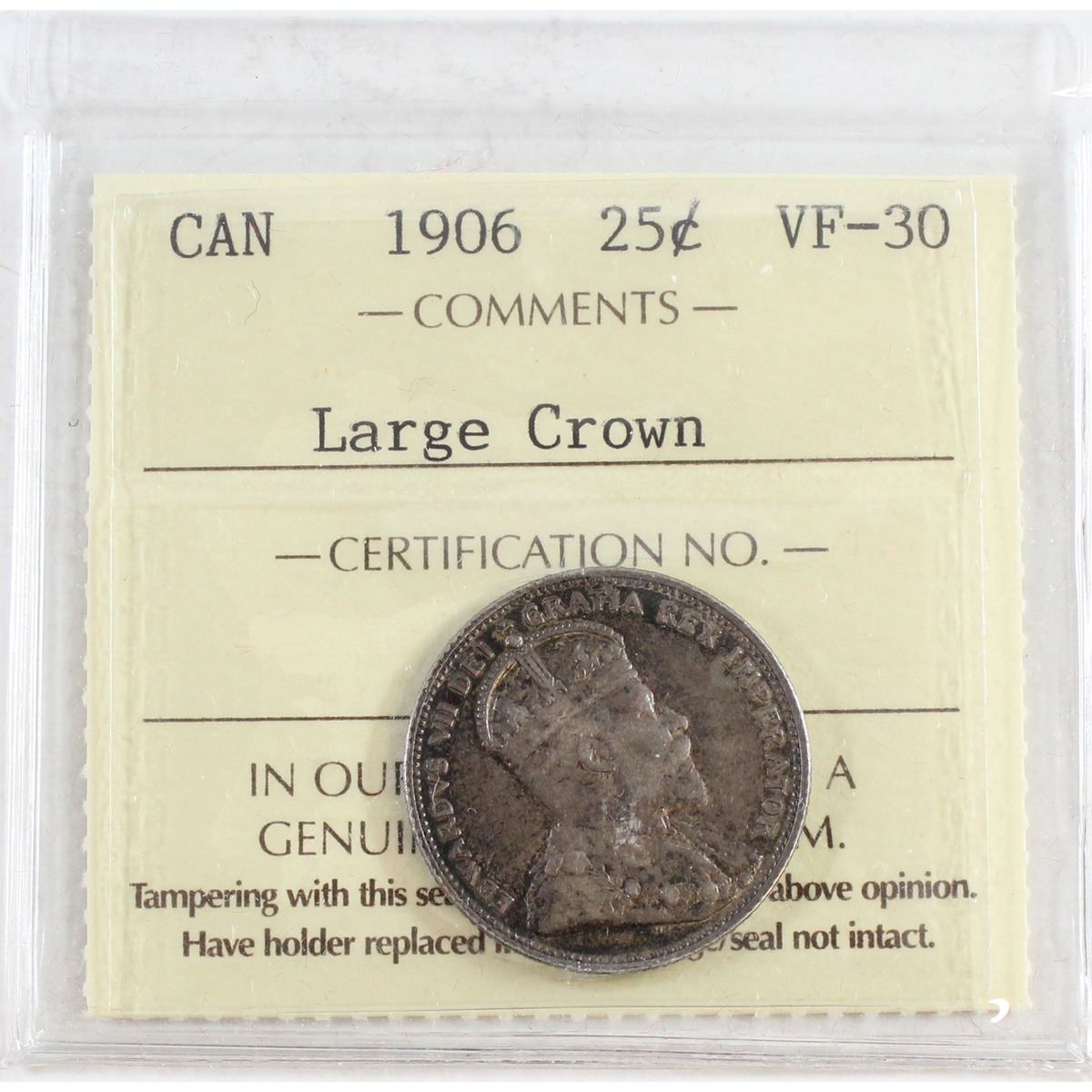 25-cent 1906 ICCS Certified VF-30 Large Crown