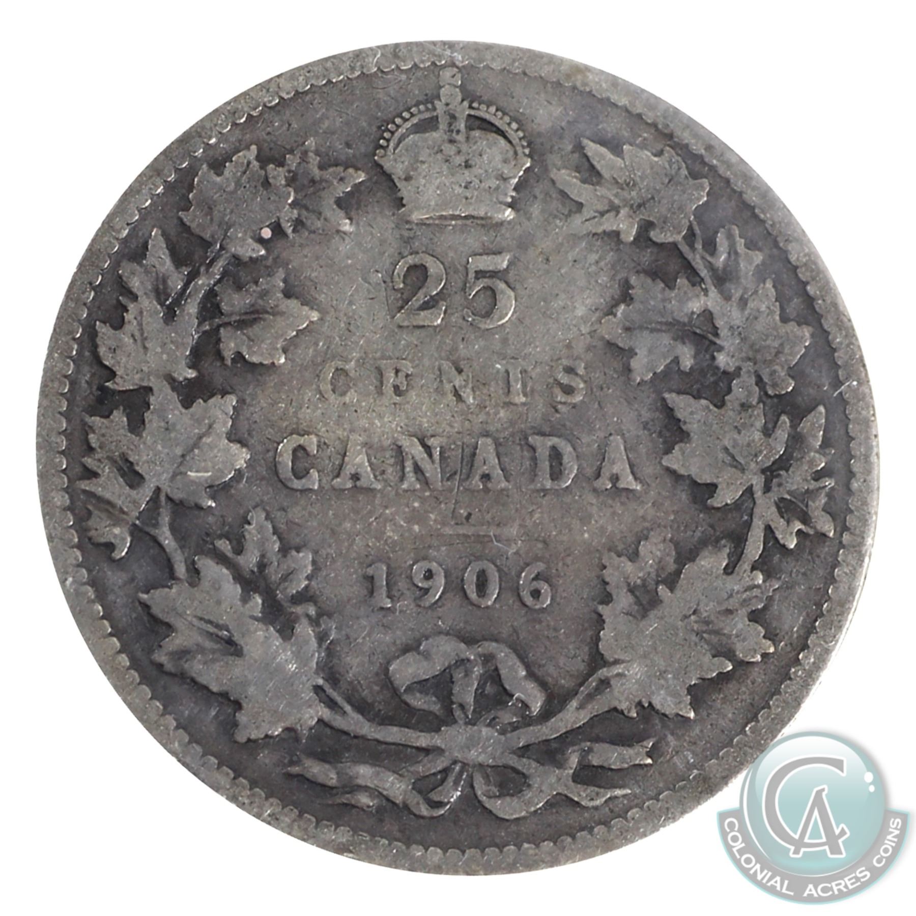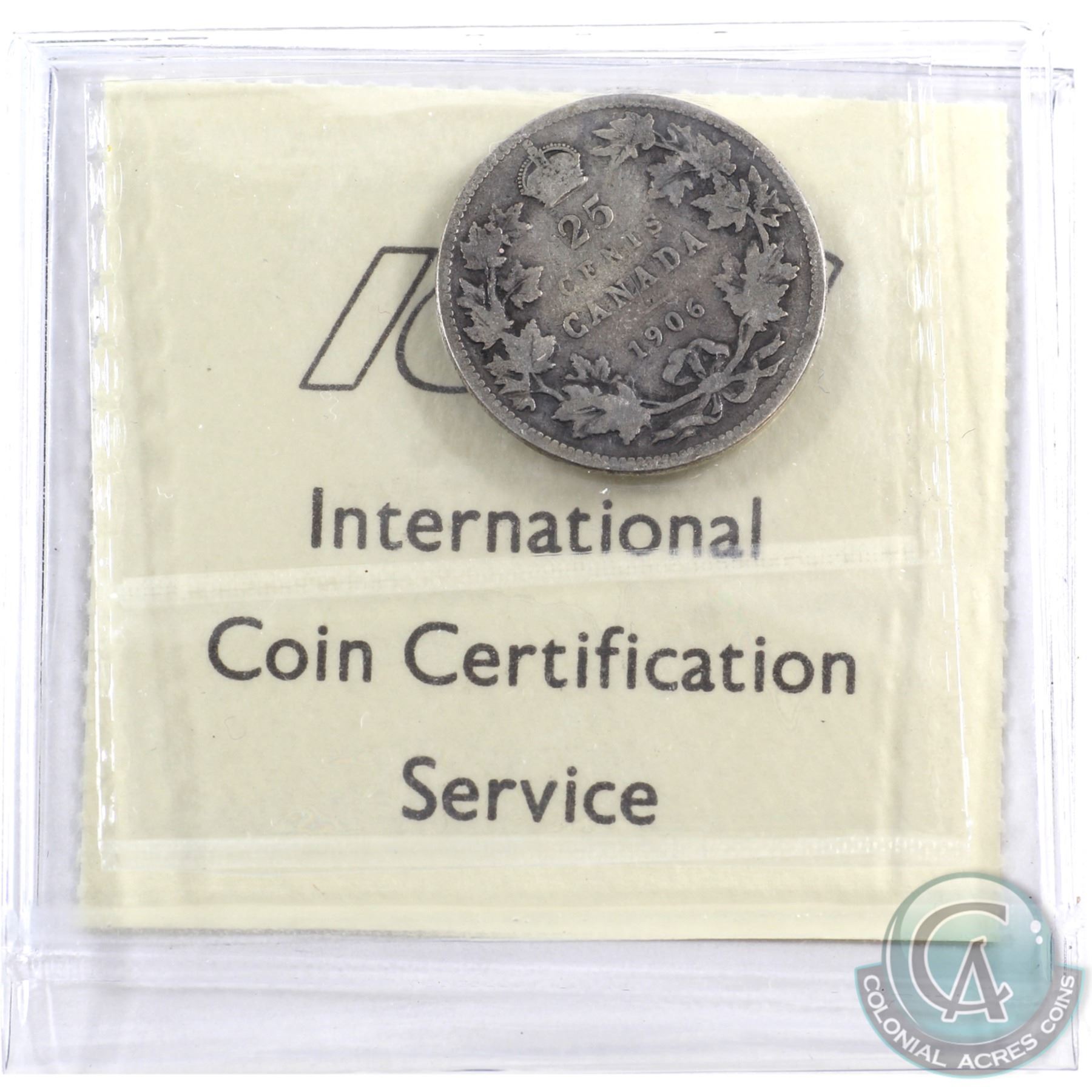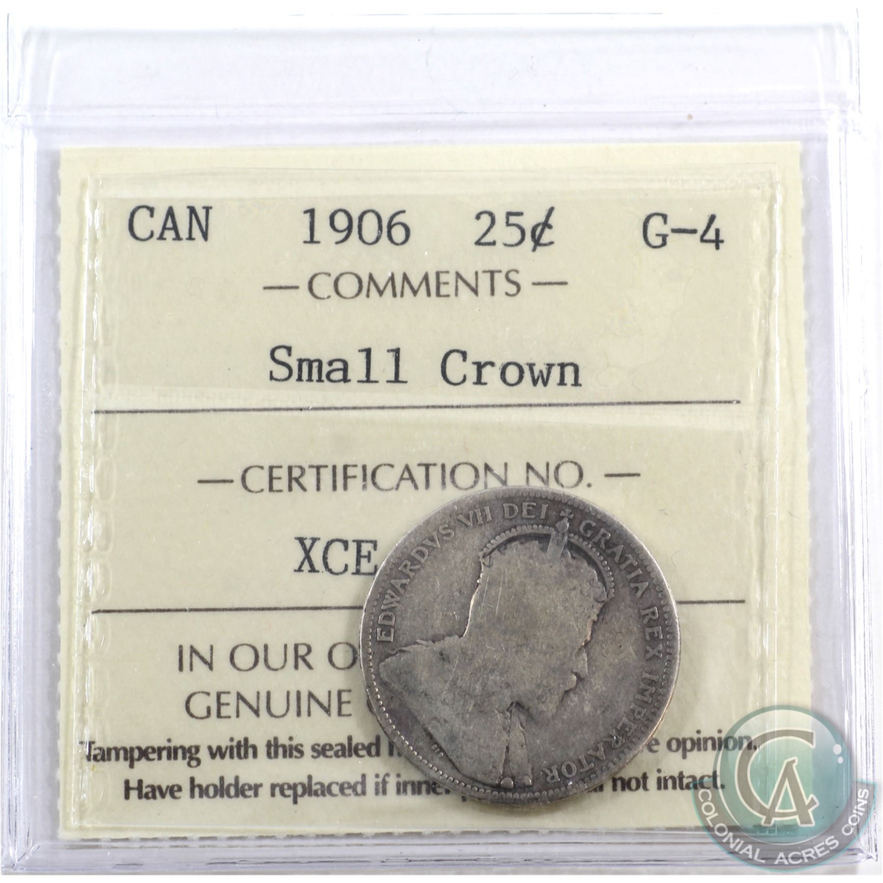 25-cent 1906 Small Crown ICCS Certified G-4. Very strong date and lettering for this grade. Worth a premium bid!