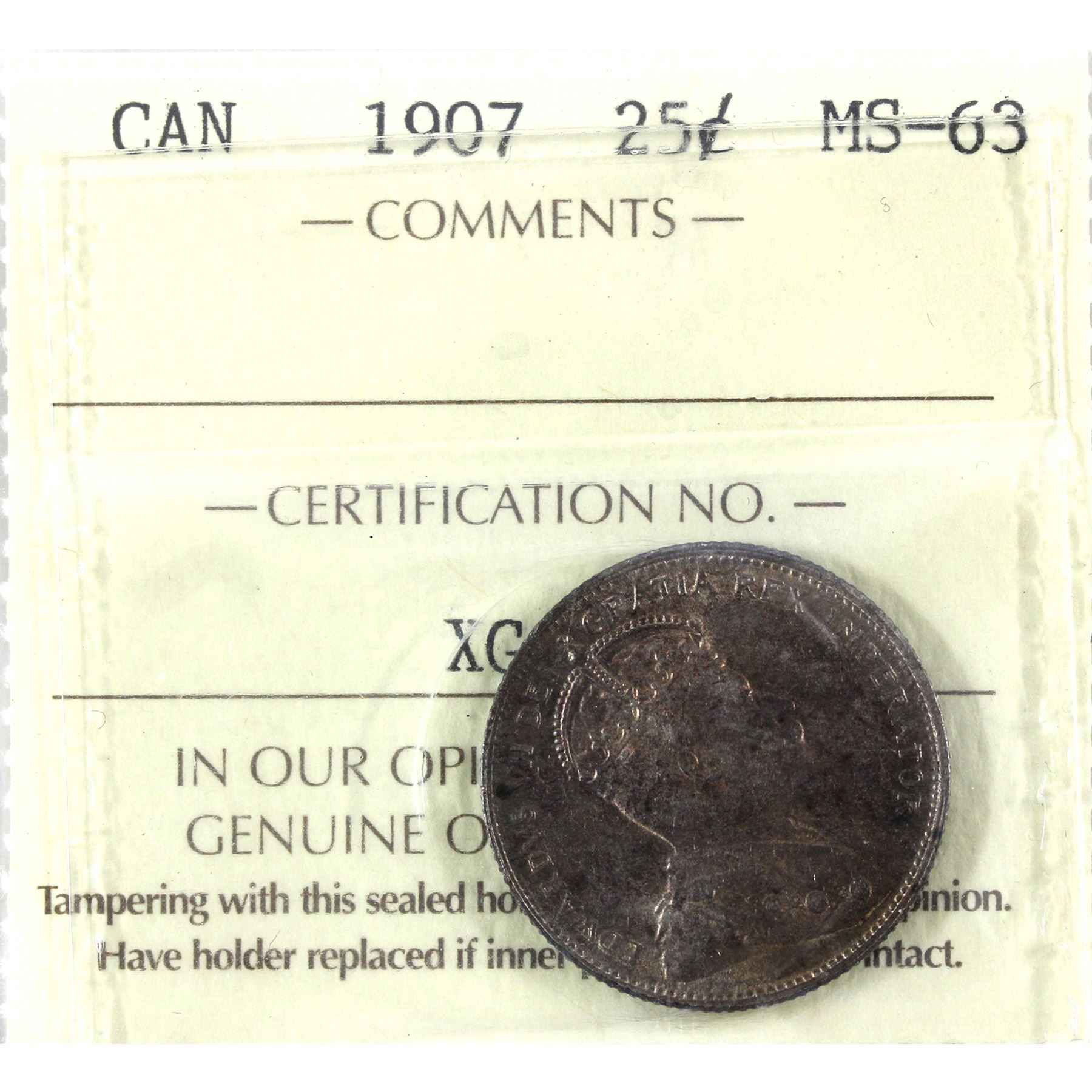 25-cent 1907 ICCS Certified MS63. Deep, Even Mauve Tones Throughout