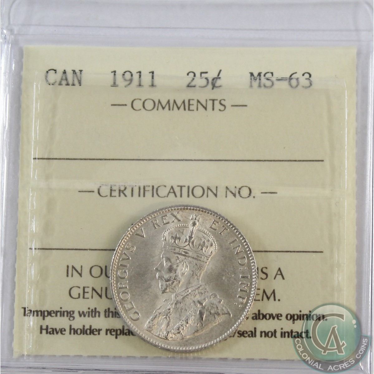 25-cent 1911 ICCS Certified MS-63. Soft Glowing Luster