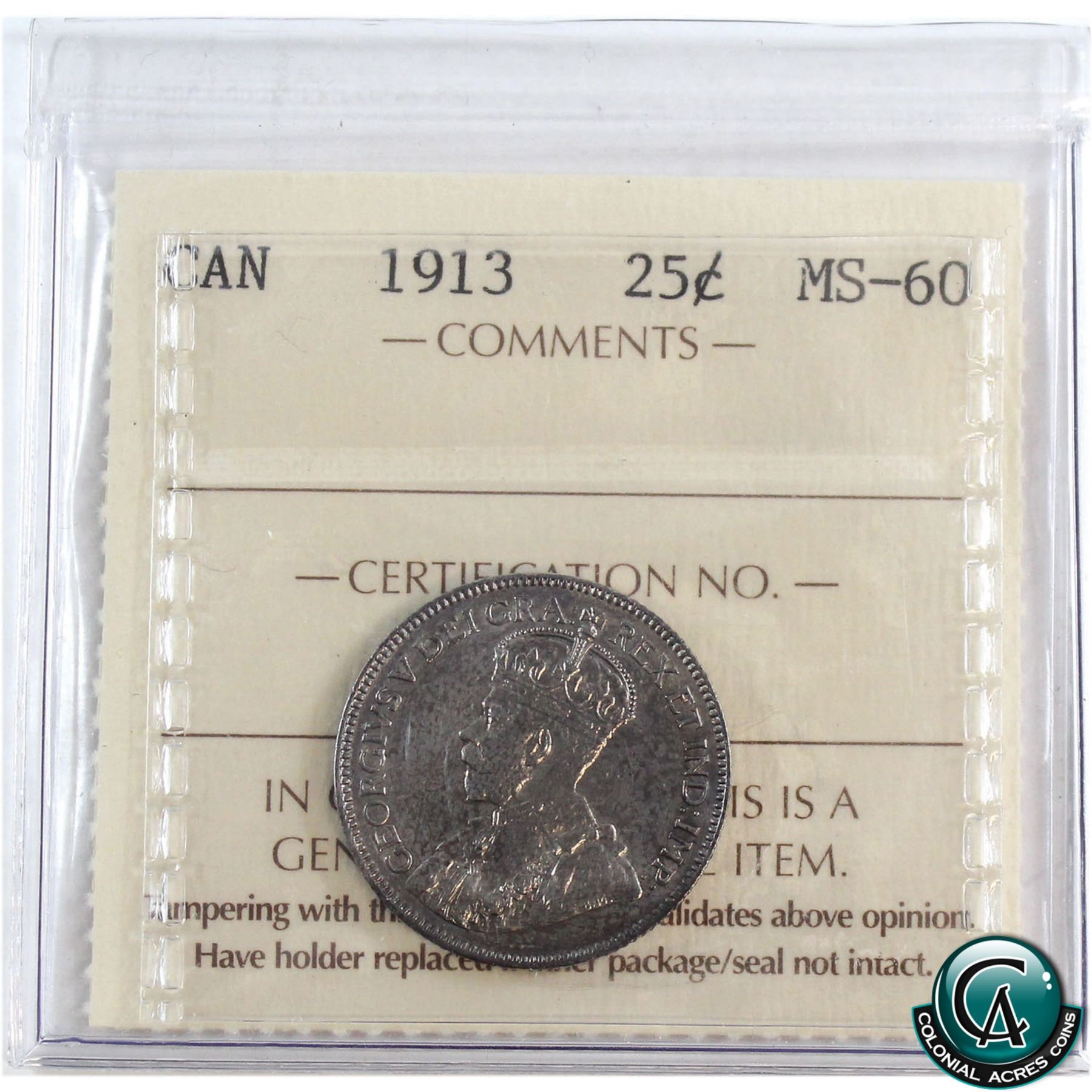25-cent 1913 ICCS Certified MS-60.
