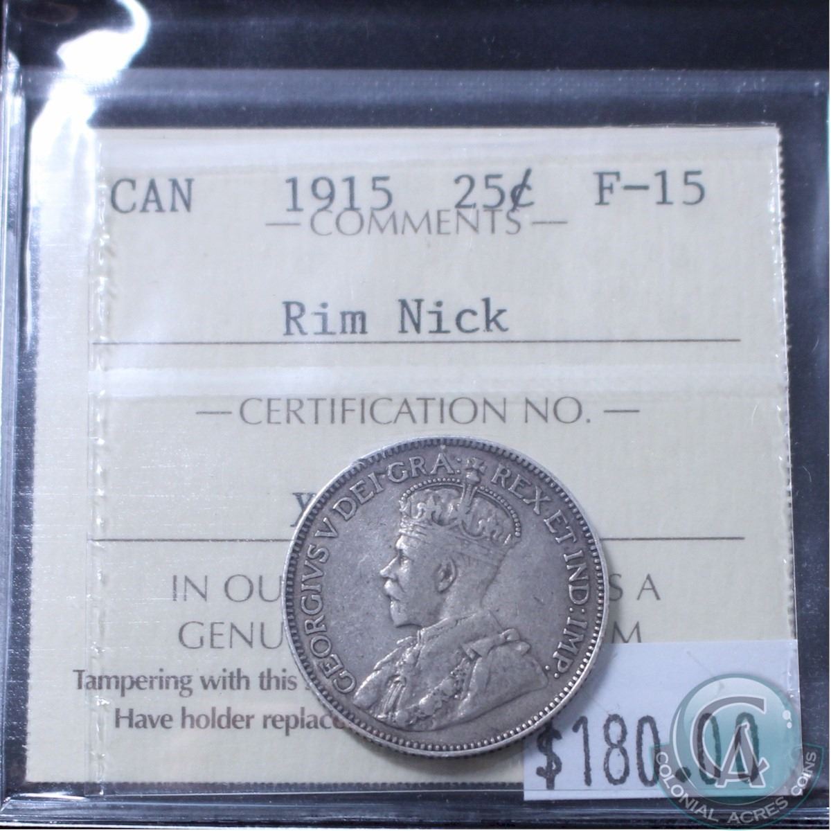 25-cent 1915 ICCS Certified F-15 (Rim Nick)