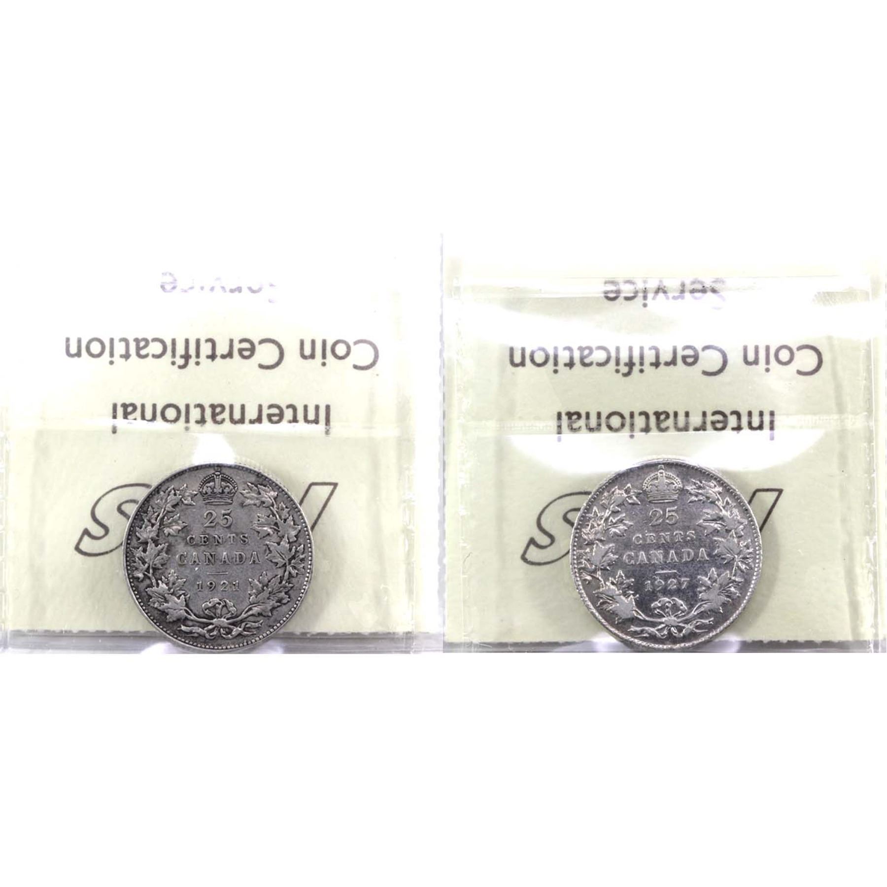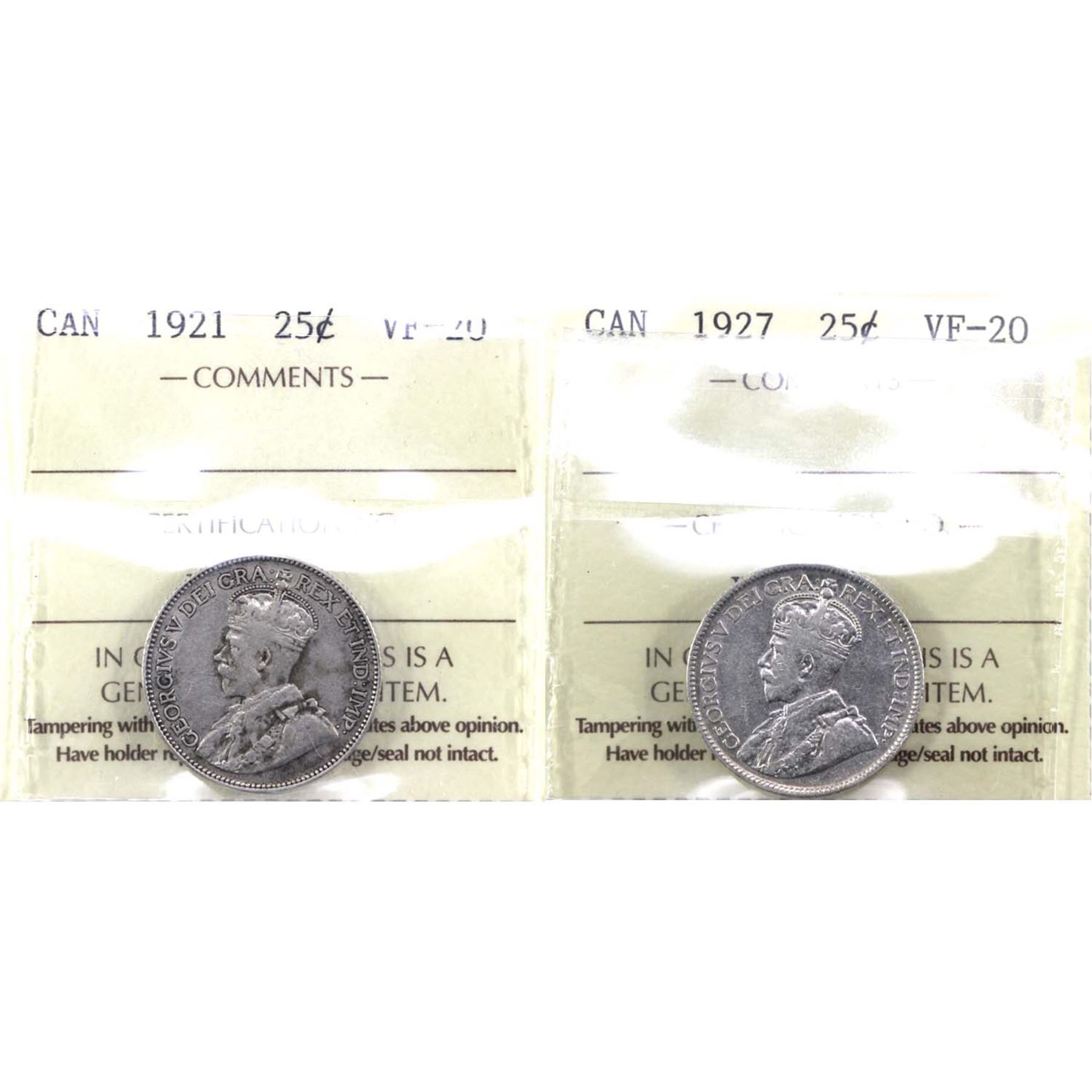 25-cent 1921 & 1927 ICCS Certified VF-20. 2pcs