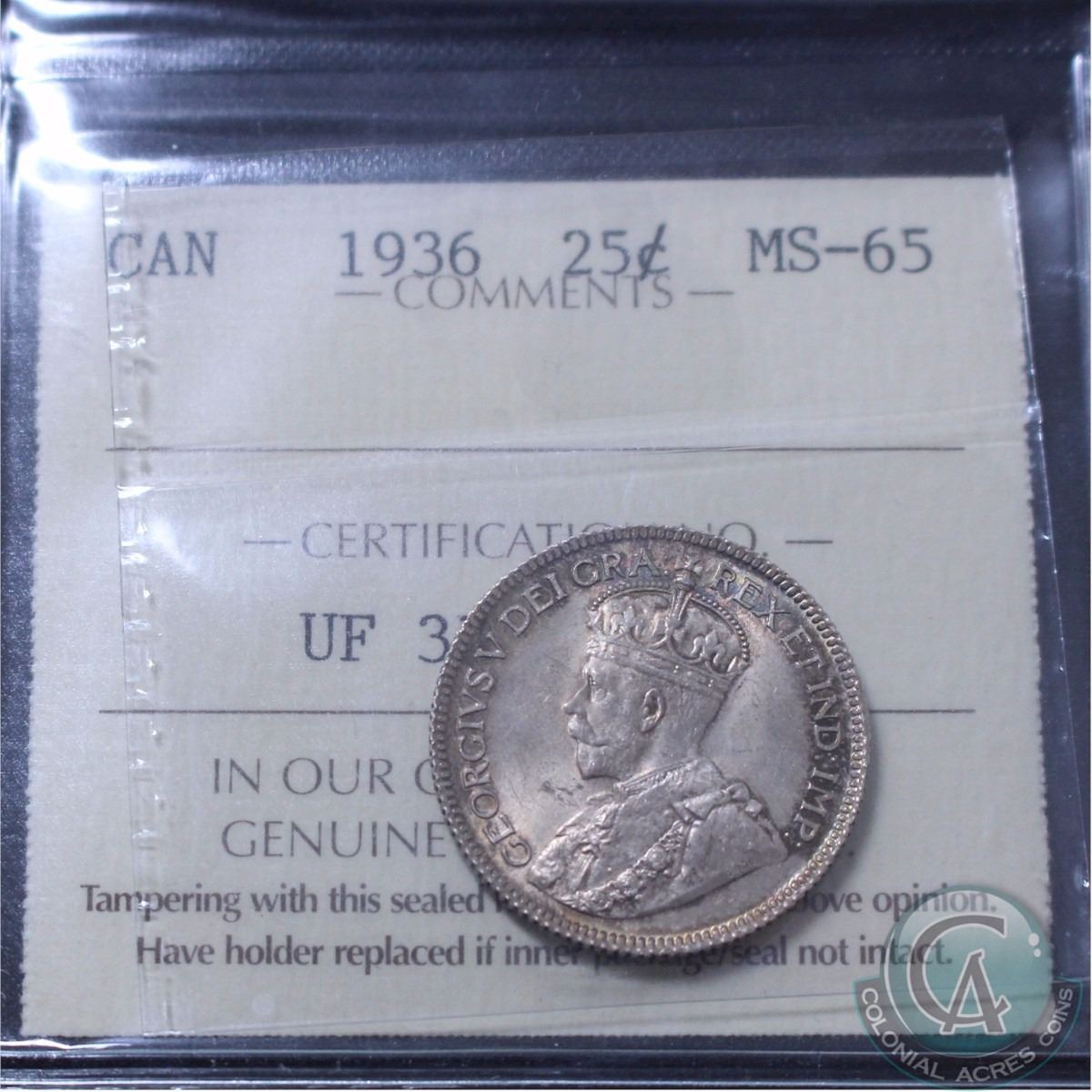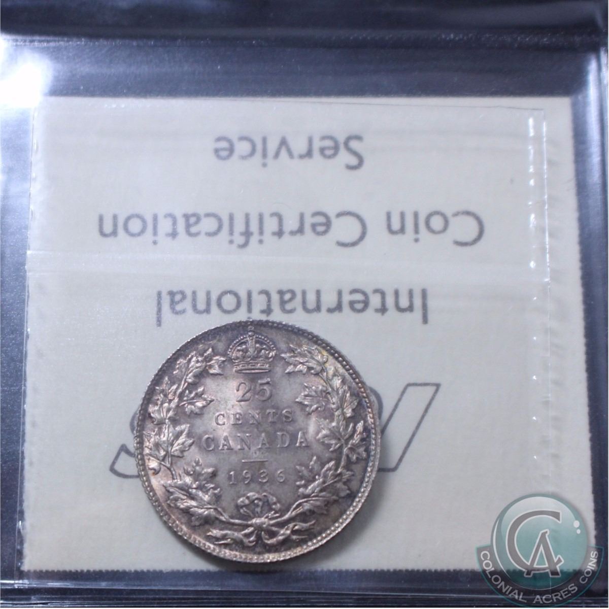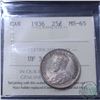 25-cent, 1936 ICCS Certified MS-65! A choice original coin with soft satin fields accented with light rose pink toning throughout. Only 1 coin graded higher by ICCS.