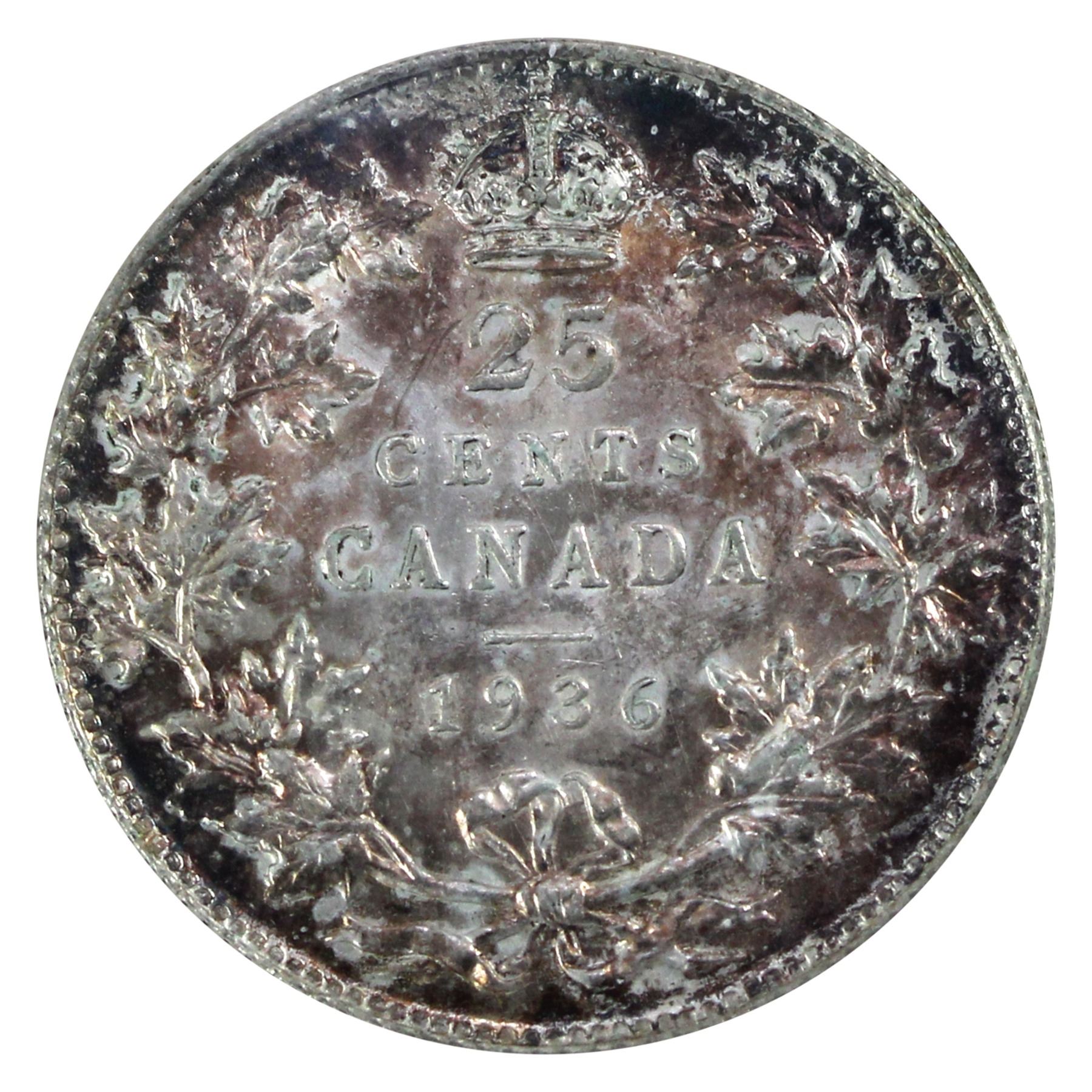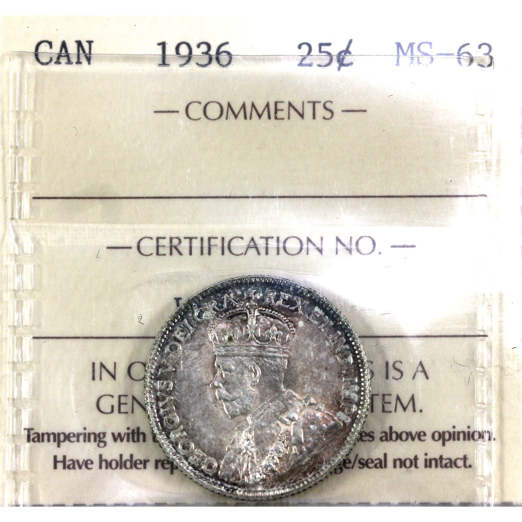25-cent 1936 ICCS Certified MS63. Frosted Mint state fields with exceptional toning throughout.