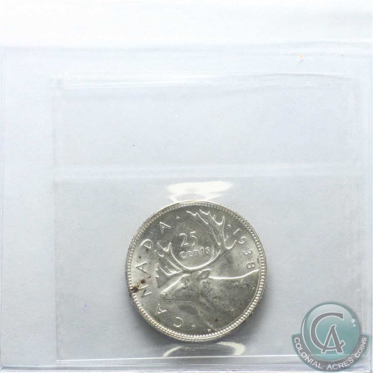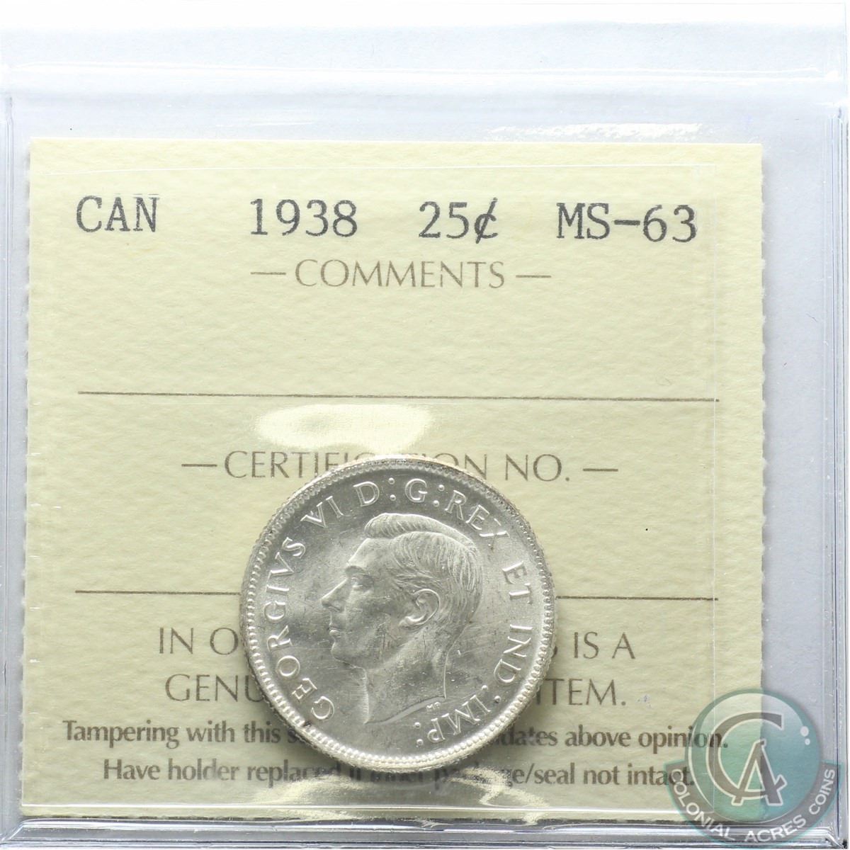25-cent 1938 ICCS Certified MS-63. A Blast white coin with strong features. Minor toning spots on the Reverse of the coin.