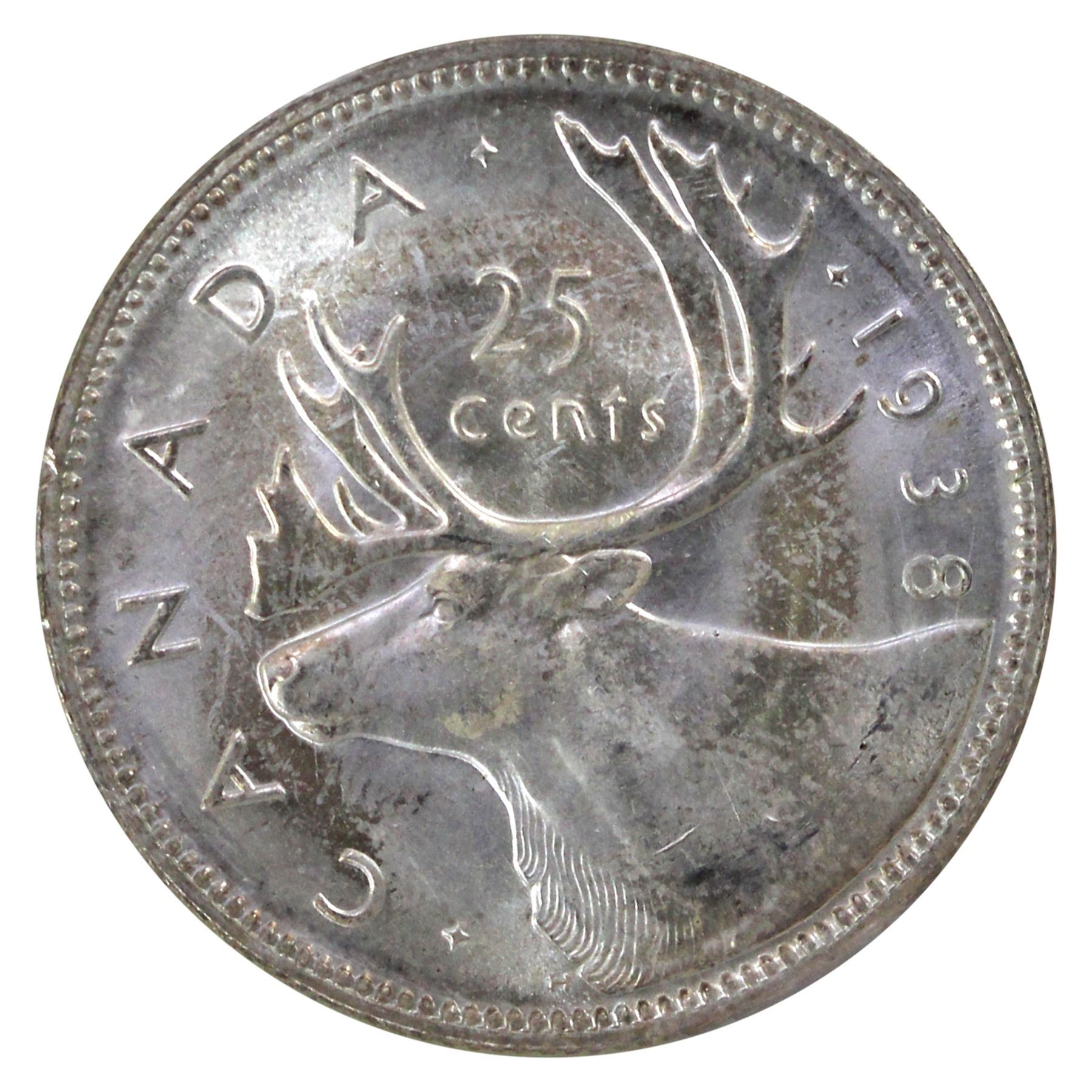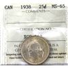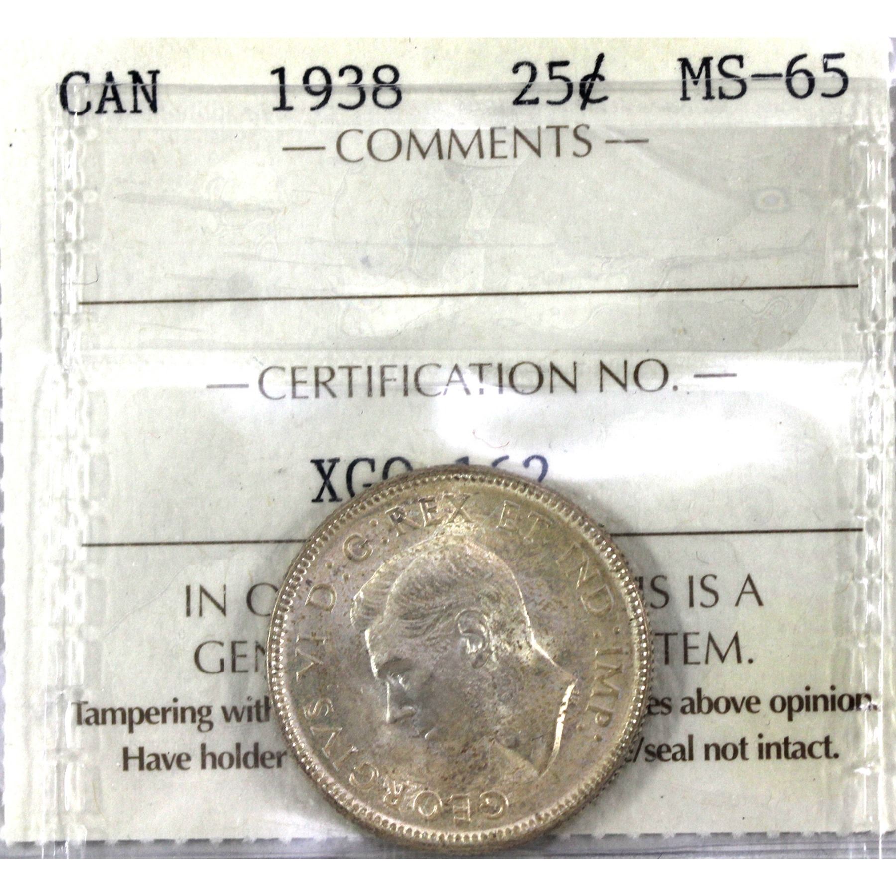 25-cent 1938 ICCS Certified MS65. Warm Natural Tones Throughout with Amber Bullseye on Reverse