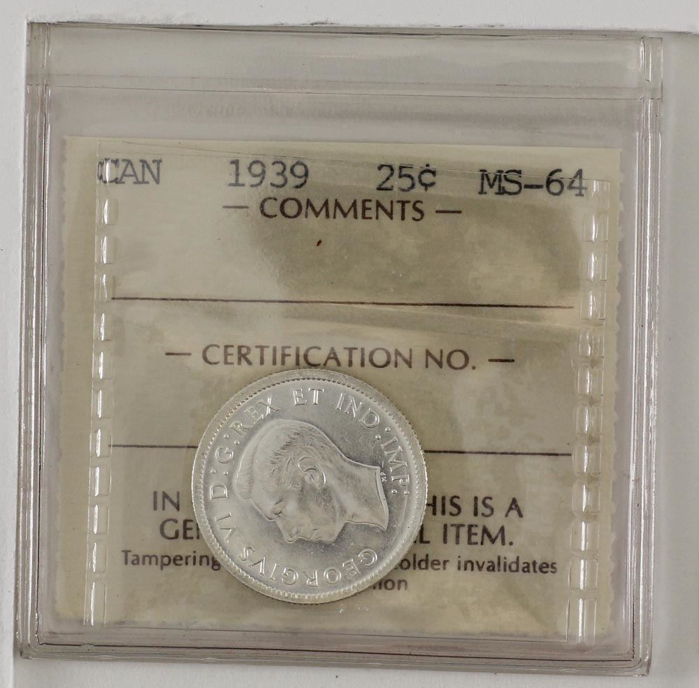 25-cent 1939 ICCS Certified MS64. Near blast white coins with soft satin fields.