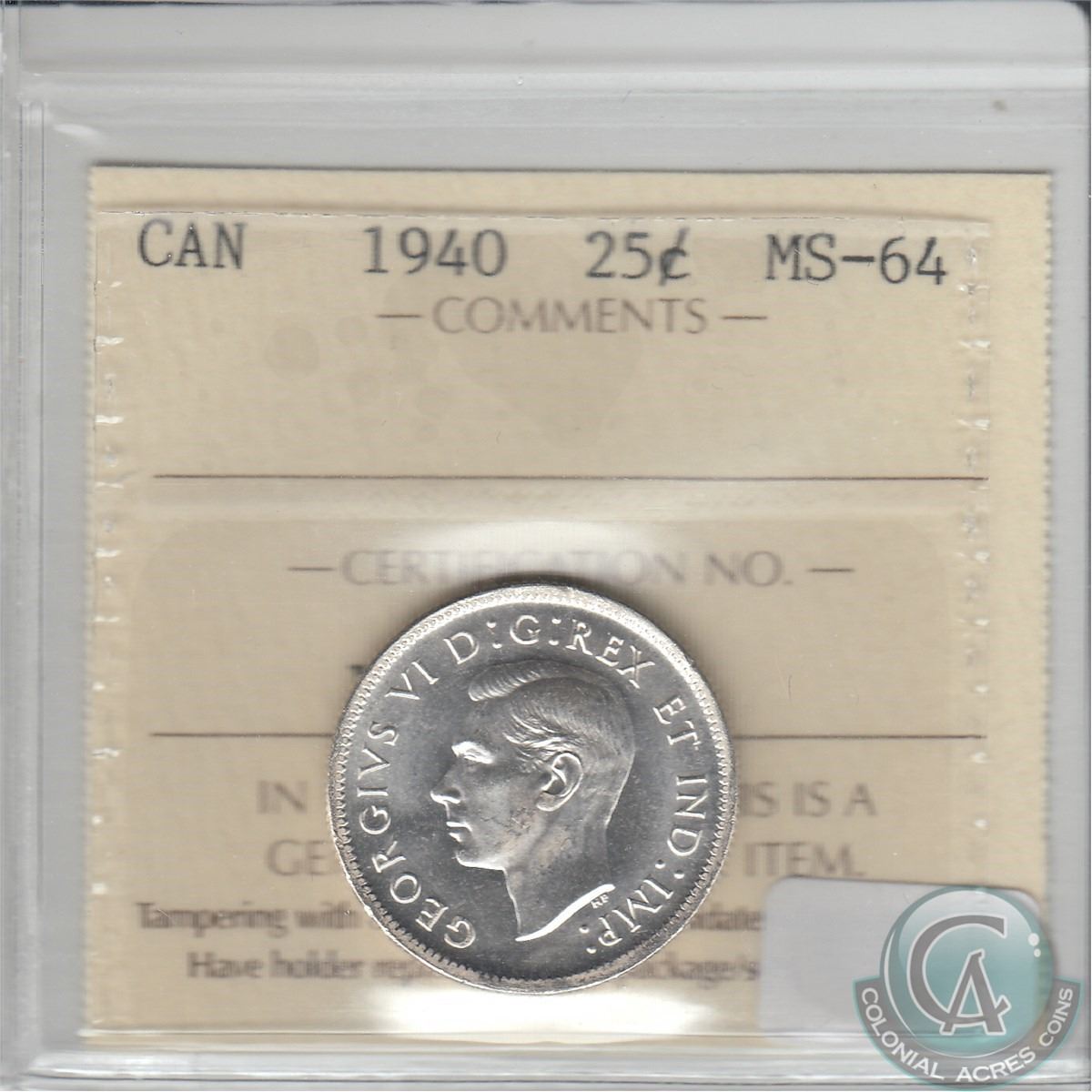 25-cent 1940 ICCS Certified MS-64. A Blast White coin with strong features.