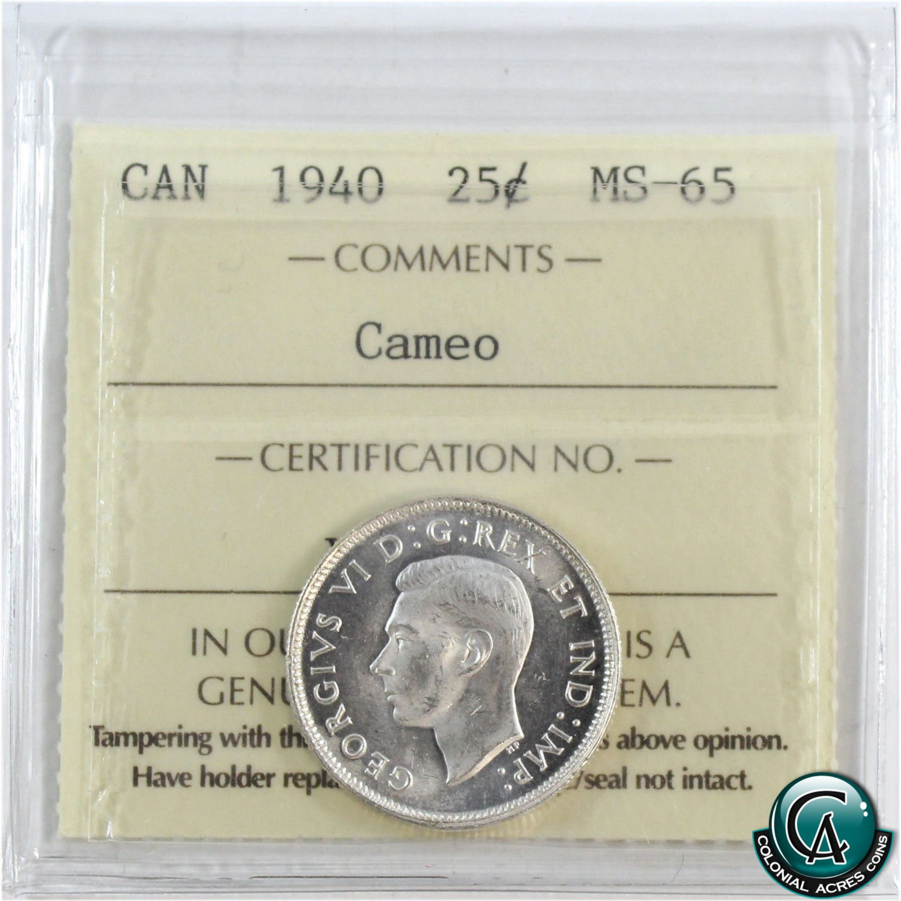 25-cent 1940 ICCS Certified MS-65 Cameo! A blast white coin with great eye appeal!