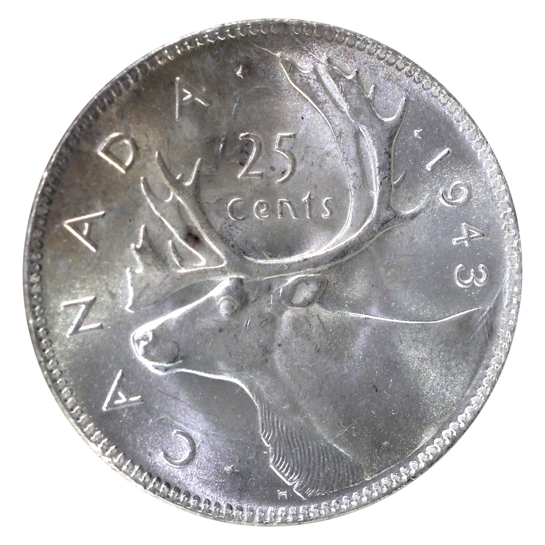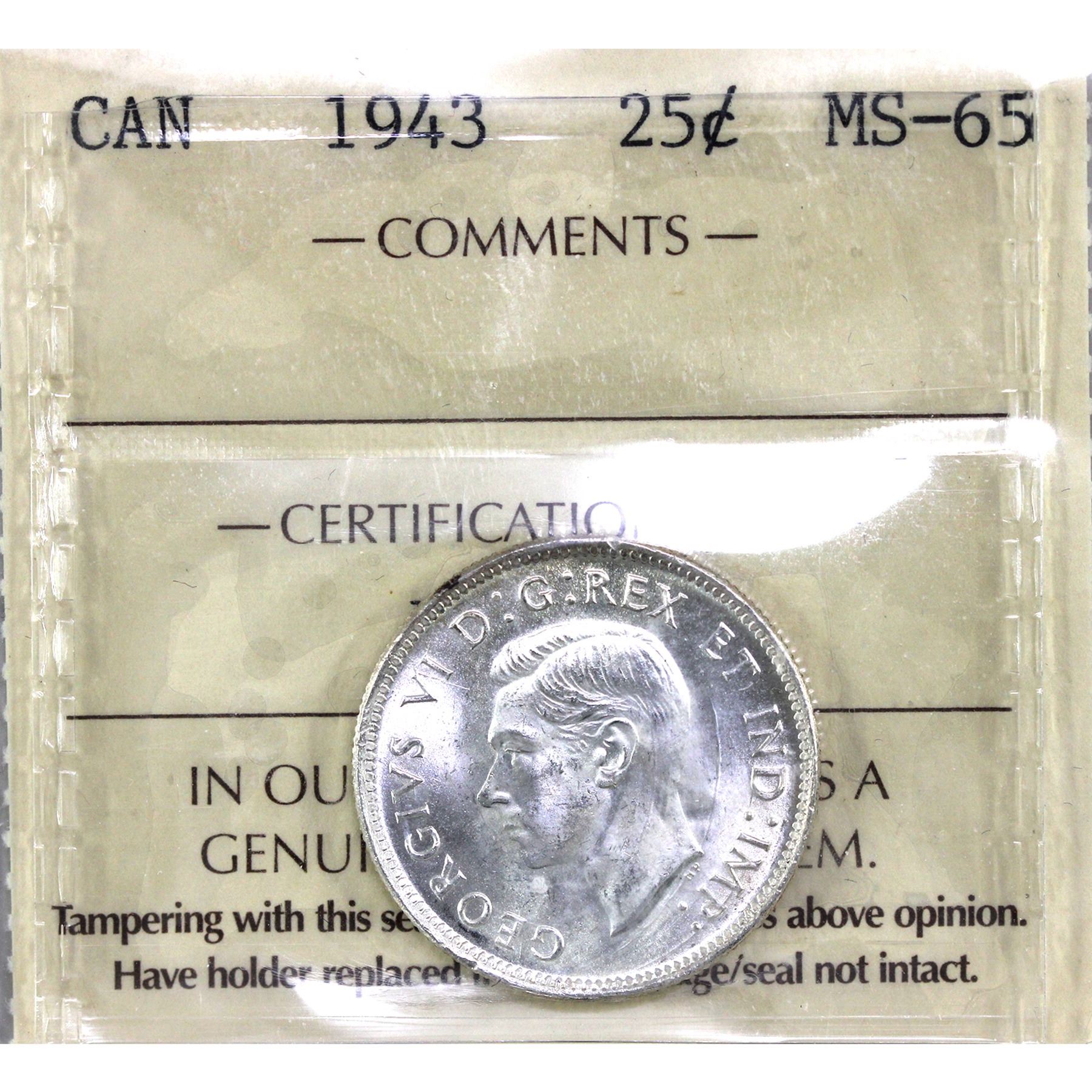 25-cent 1943 ICCS Certified MS65. An Eye Catching Coin with Warm Natural Tones.