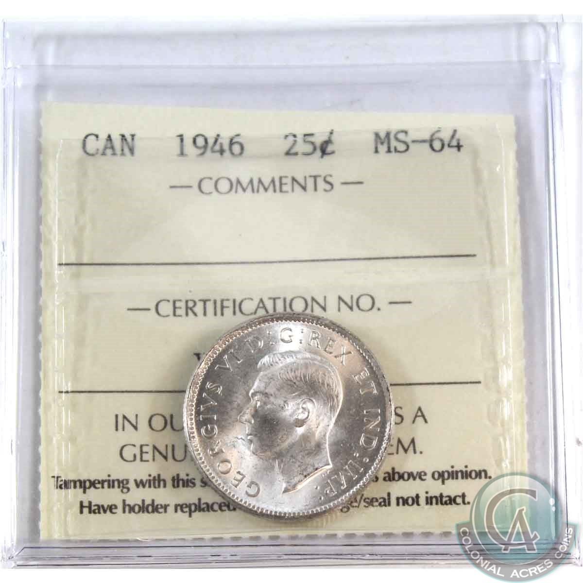25-cent 1946 ICCS Certified MS-64. Lustrous Blast White coin