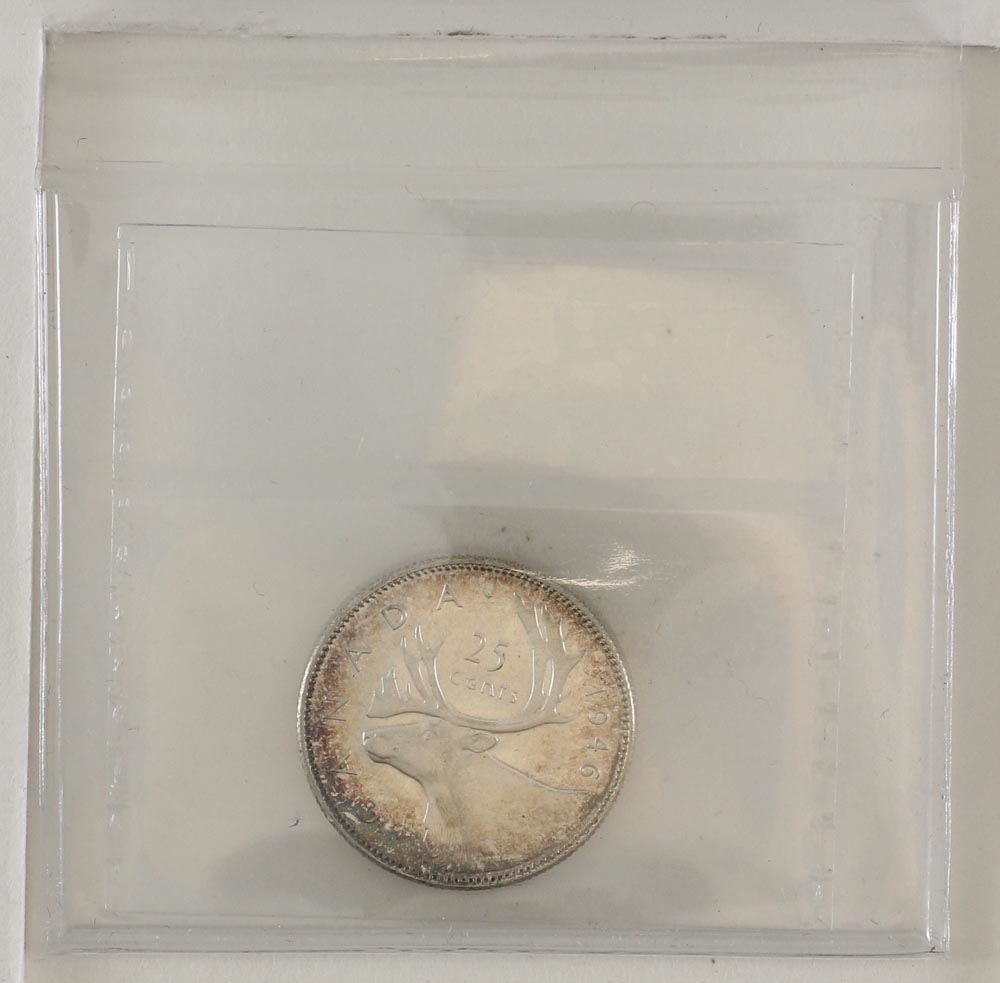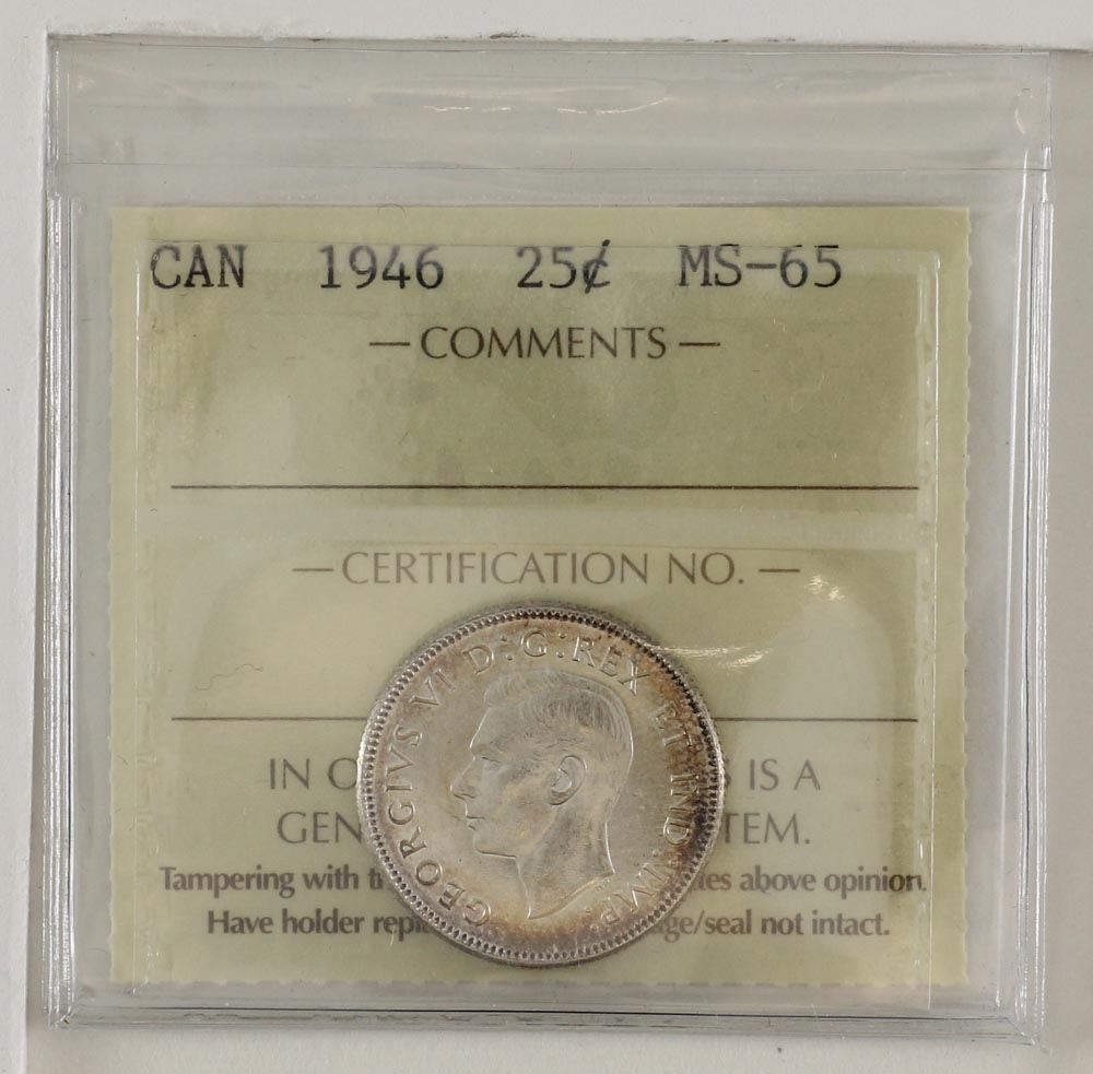 25-cent 1946 ICCS MS65. Beautiful rainbow toning on the reverse.