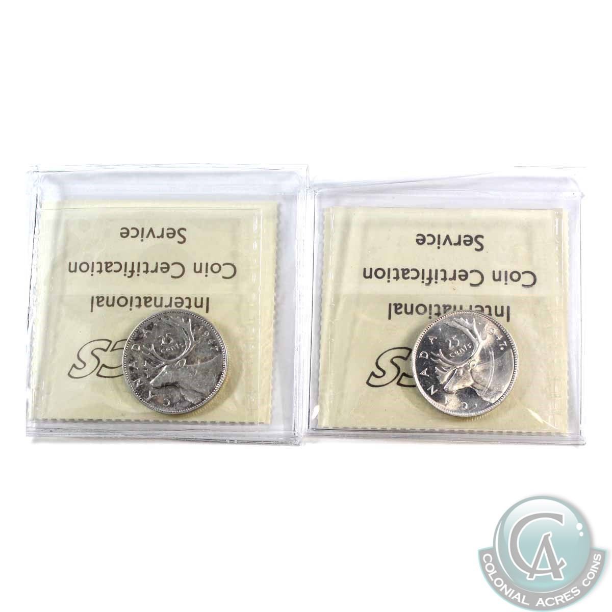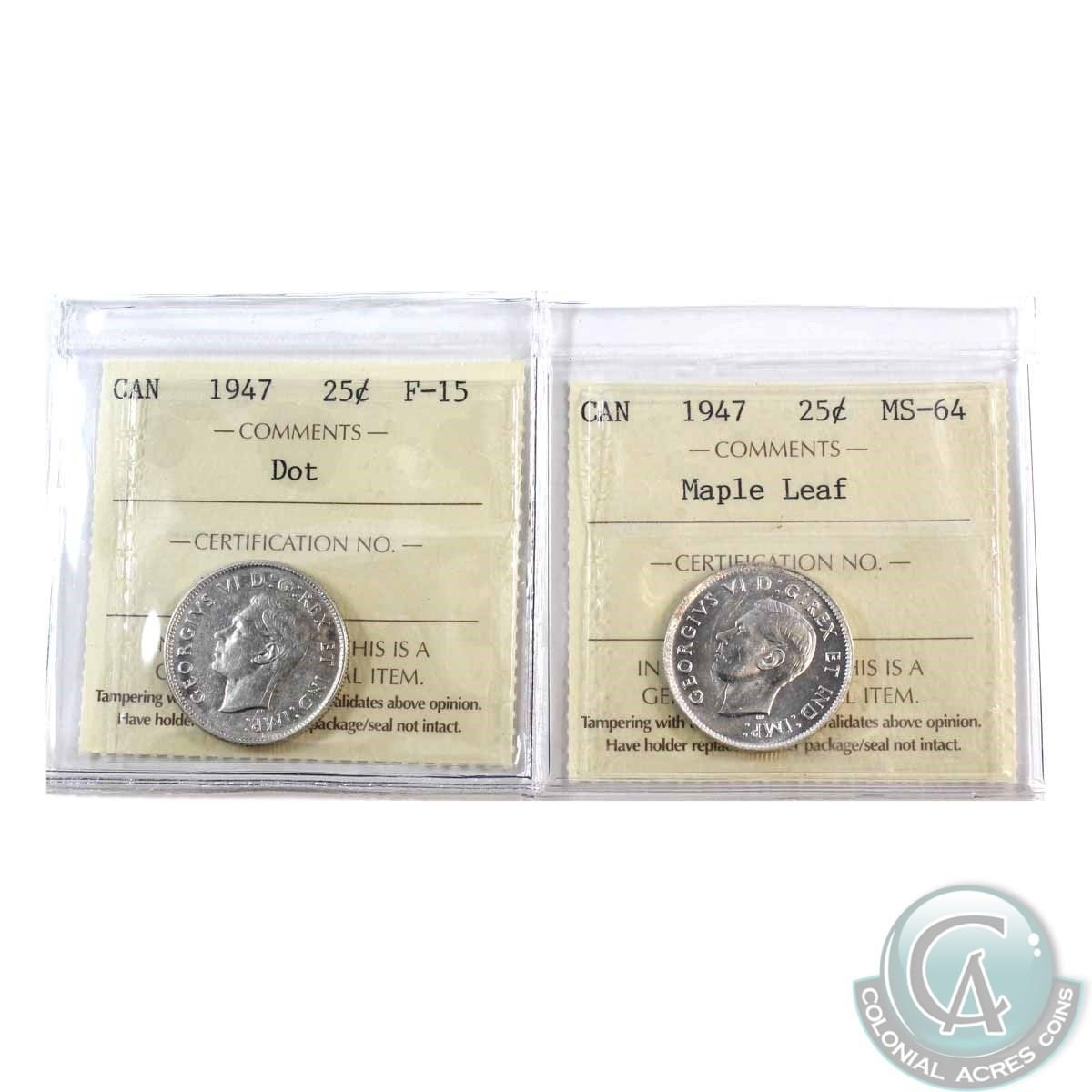 25-cent 1947 Dot ICCS F-15 & 1947 Maple Leaf ICCS MS-64. 2 pcs