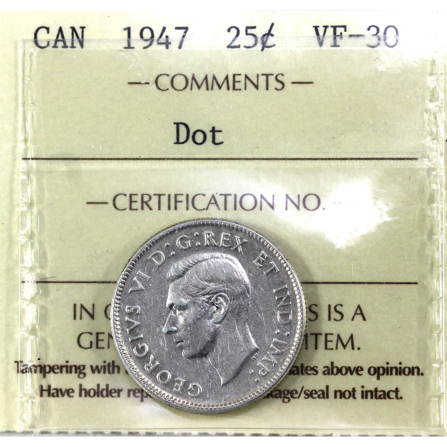 25-cent 1947 Dot ICCS VF30