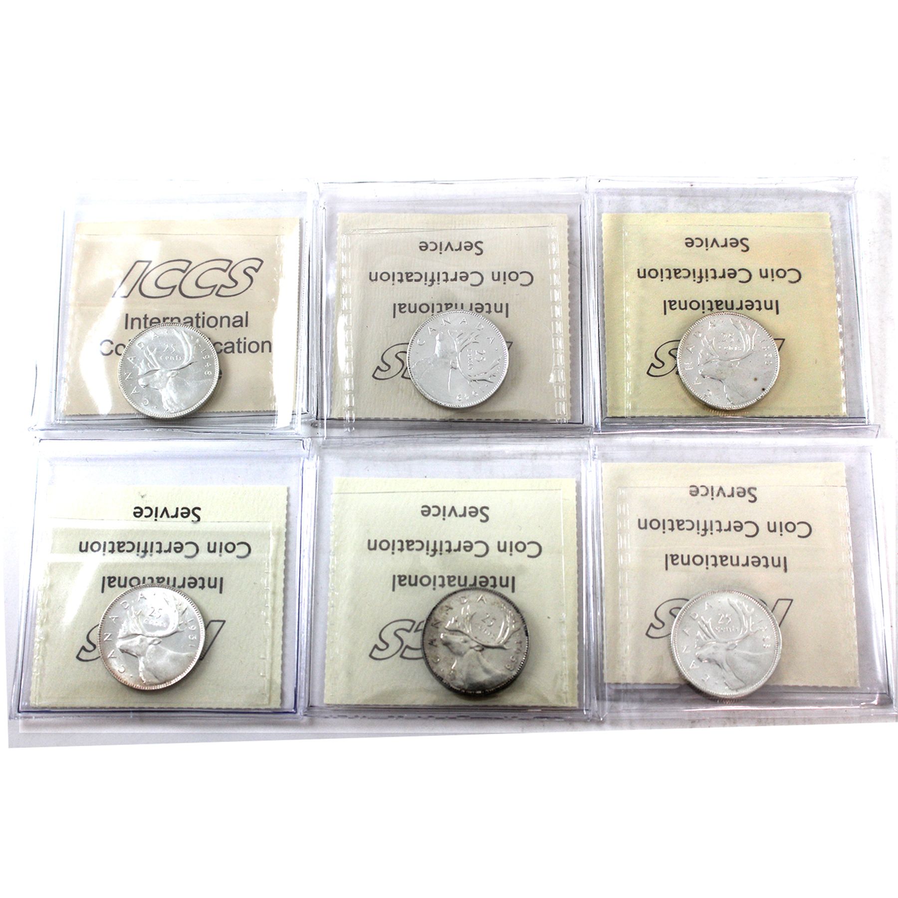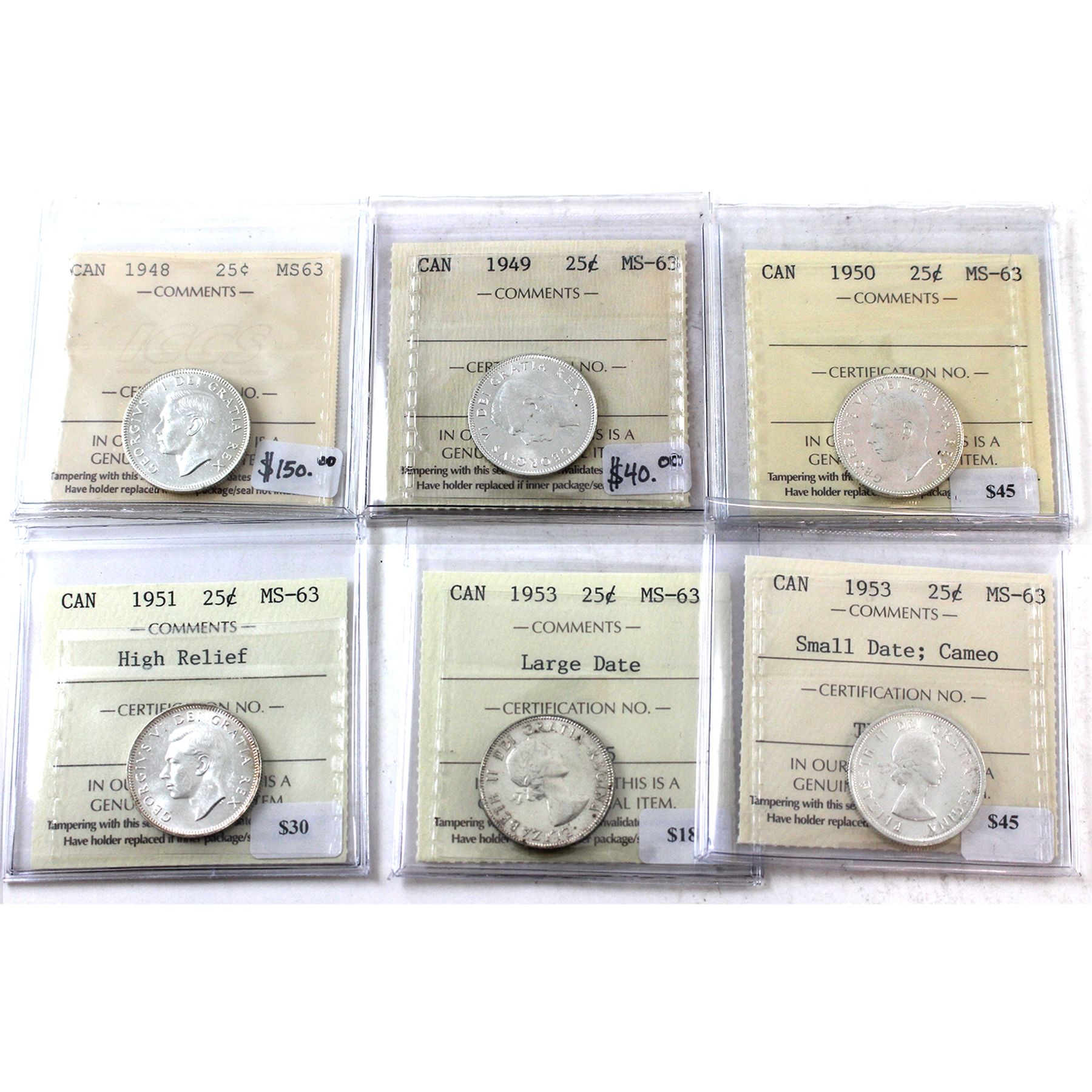 25-cent 1948, 1949, 1950, 1951 High Relief, 1953 Large Date, 1953 Small Date; Cameo ICCS MS63. 6pcs.