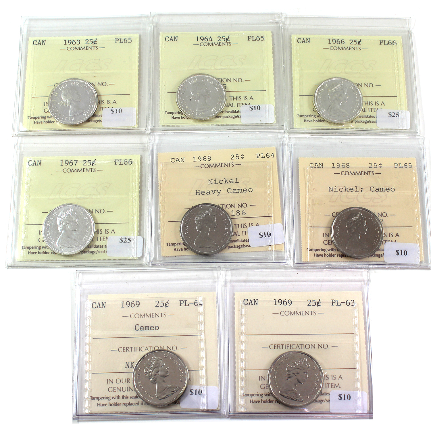 INCLUDES: 1963 PL65, 1968 nickel PL64; heavy cameo, 1969 PL64 cameo & more! Sold as is; please see images for details. 8pcs.