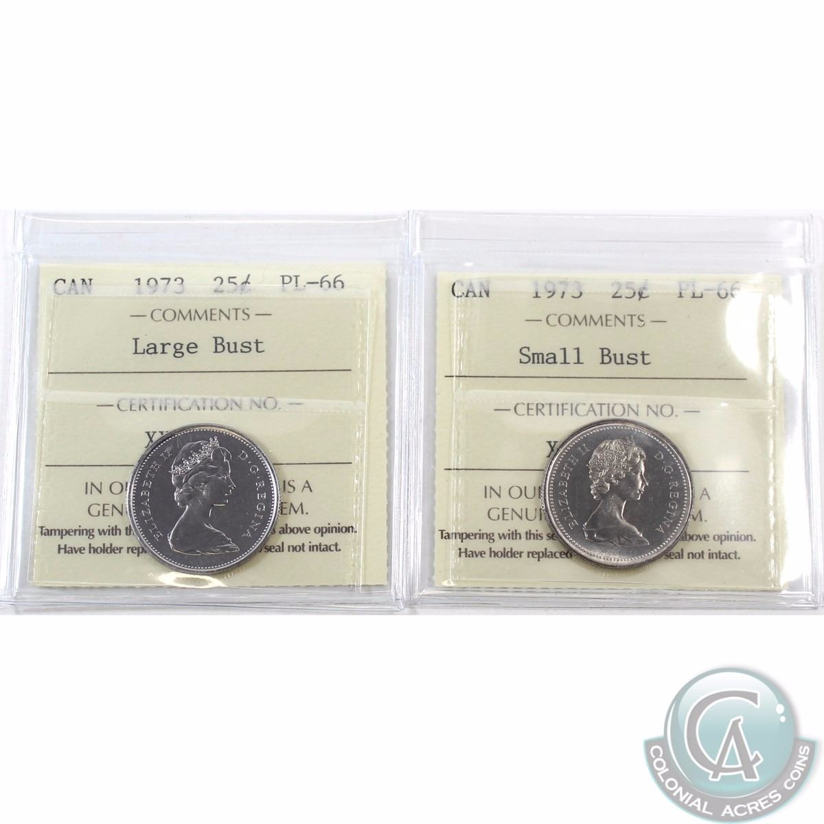 25-cent 1973 Small Bust & 1973 Large Bust ICCS Certified PL-66. 1973 Large bust is tied for highest