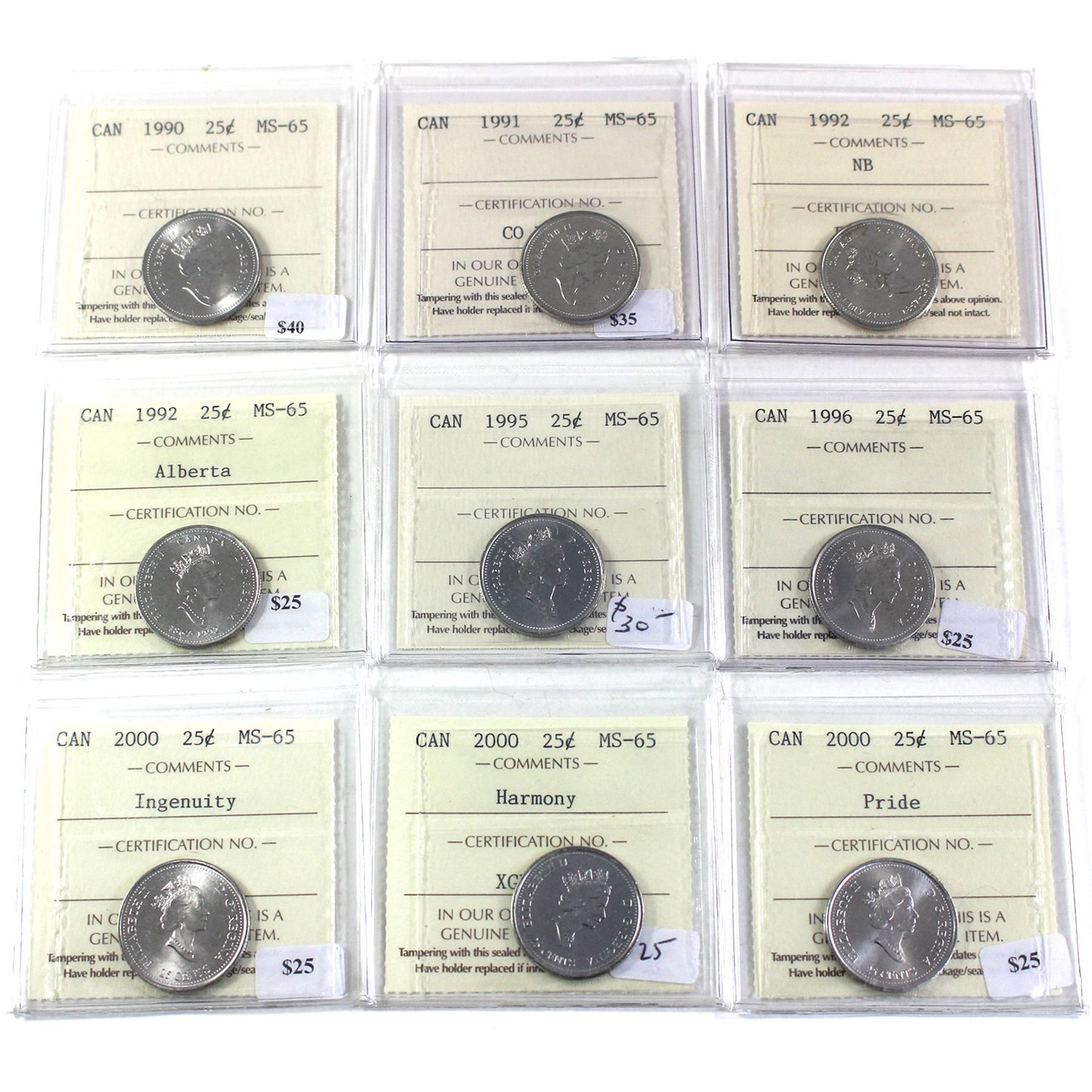 25-cent 1990, 1991, 1992 NB, 1992 Alberta, 1995, 1996, 2000 Ingenuity, 2000 Harmony & 2000 Pride ICCS MS65. 9pcs.