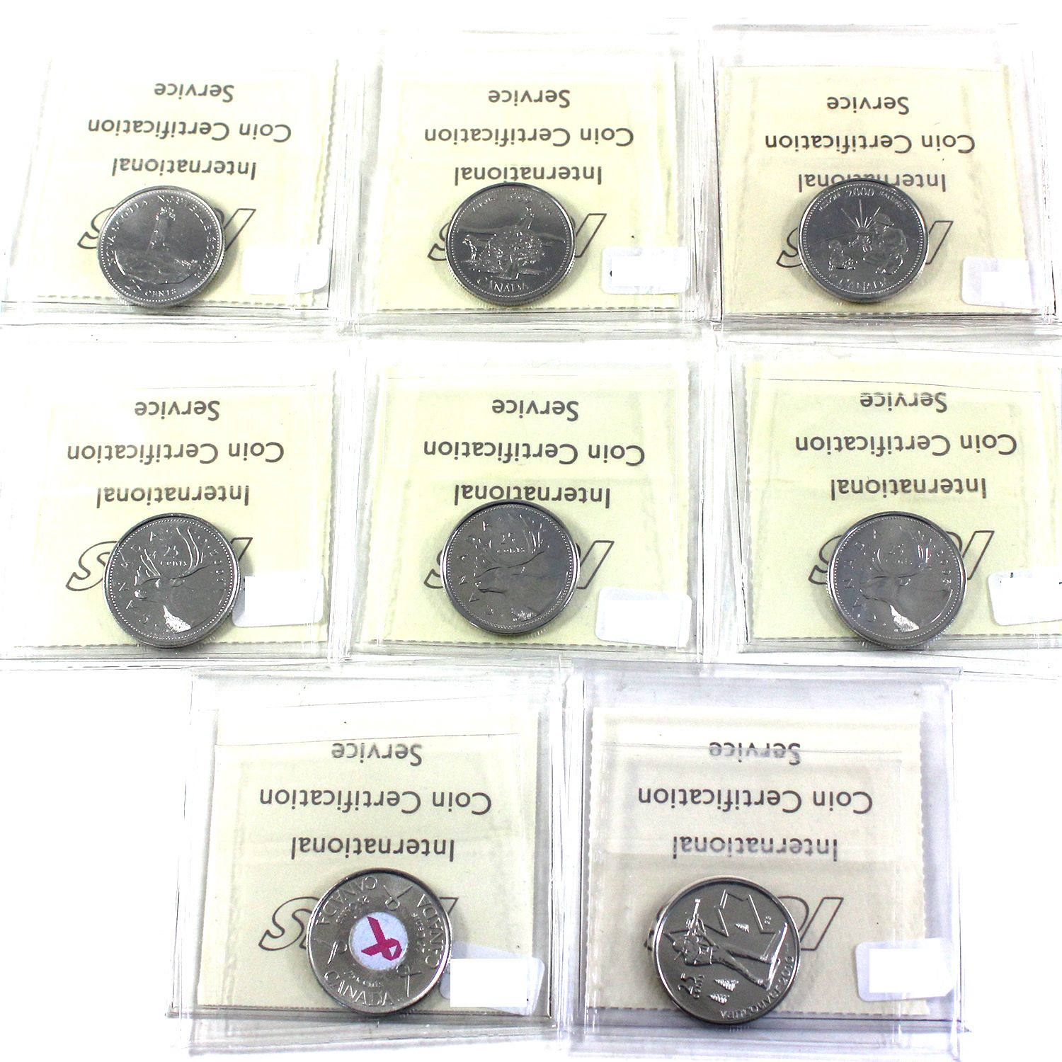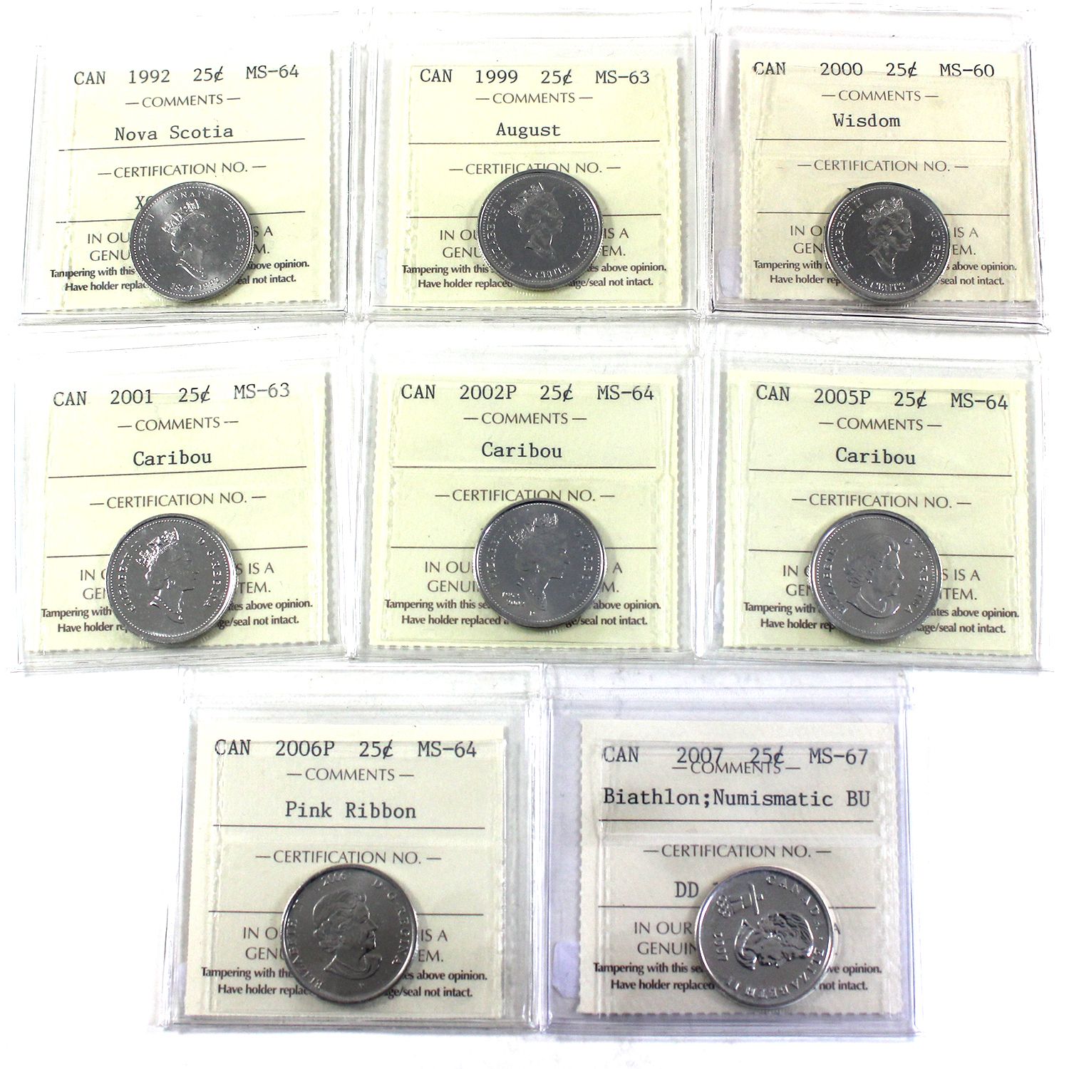 25-cent 1992-2007 ICCS MS60-67. INCLUDES: 1992 Nova Scotia MS64, 1999 August MS63, 2000 Wisdom MS60, 2001 MS63, 2002P MS64, 2005P MS64, 2006P Pink Ribbon MS64, & 2007 Biathlon MS67 NBU ICCS Certified. 8pcs.