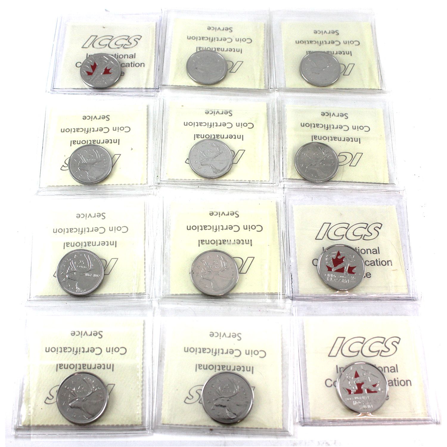25-cent 1992, 1994, 1995, 1998W, 1998, 1999, 2009 Men's Hockey Painted & 2010 Caribou MS67, 1999P, 2001P & 2009 Klassen Painted MS66 & 2009 Women's Hockey Painted MS64. 12pcs.