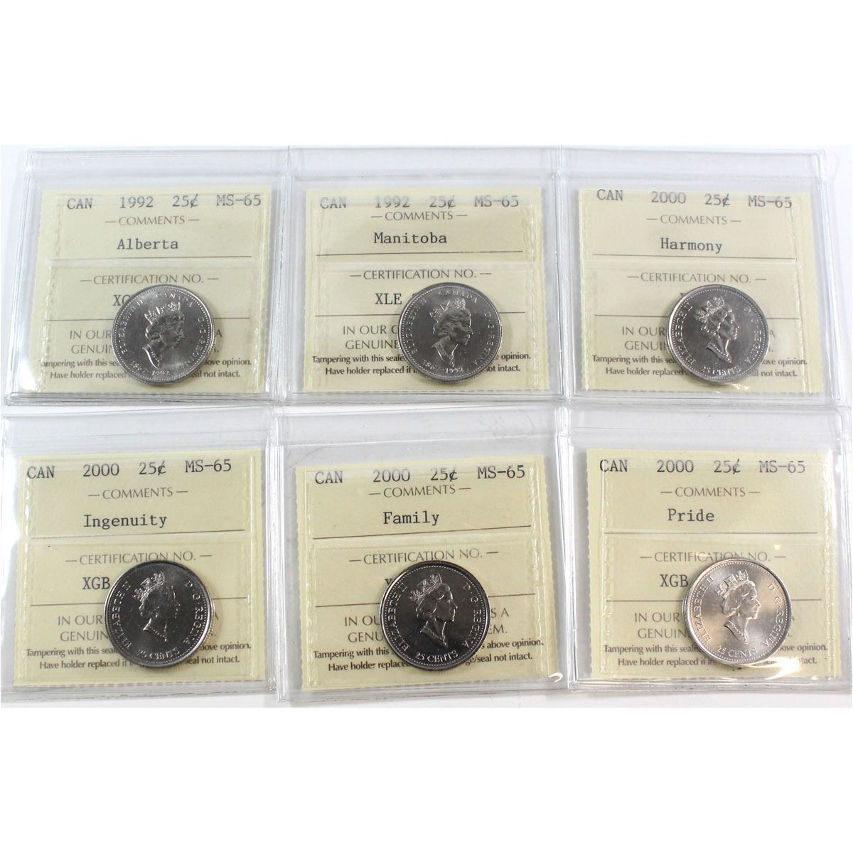 25-cent 1992 Alberta, 1992 Manitoba, 2000 Harmony, 2000 Ingenuity, 2000 Family & 2000 Pride ICCS Certified MS-65. 6pcs