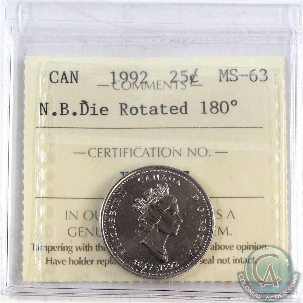 25-cent 1992 New Brunswick Die Rotated 180 Degrees ICCS Certified MS-63