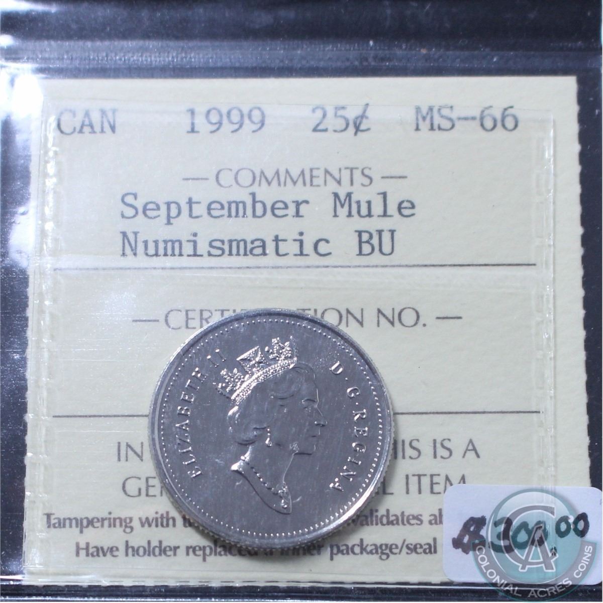 25-cent 1999 September Mule ICCS Certified MS-66; Numismatic BU. Only 1 Graded Higher by ICCS.