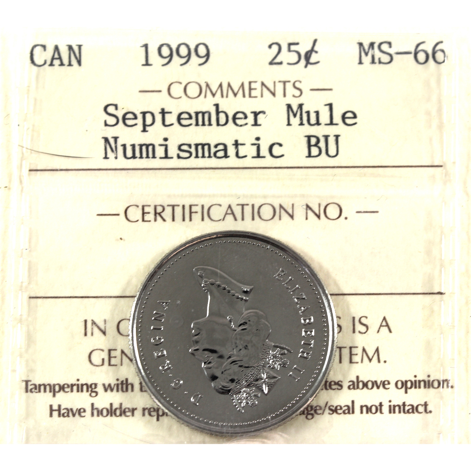 25-cent 1999 September Mule; Numismatic BU ICCS MS66