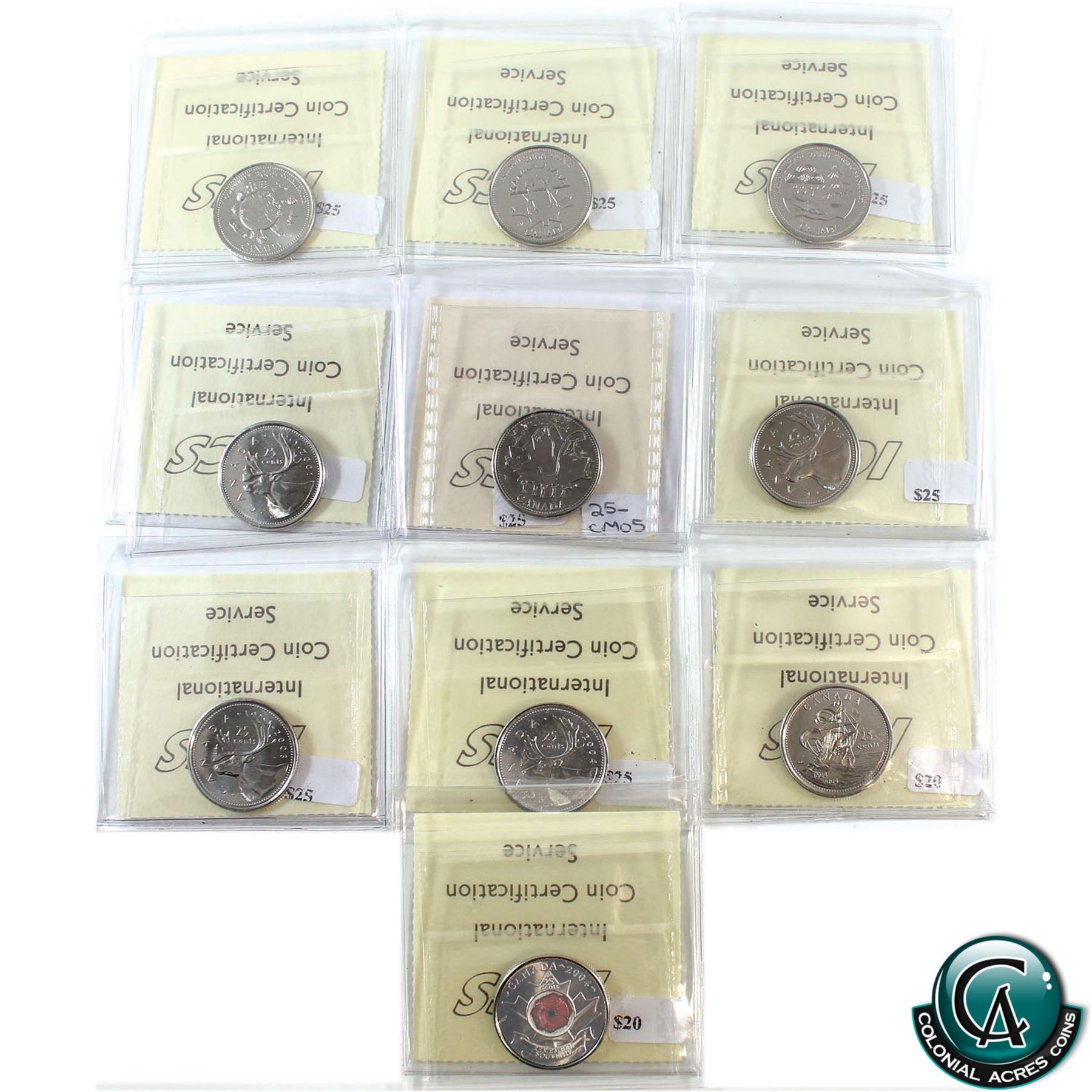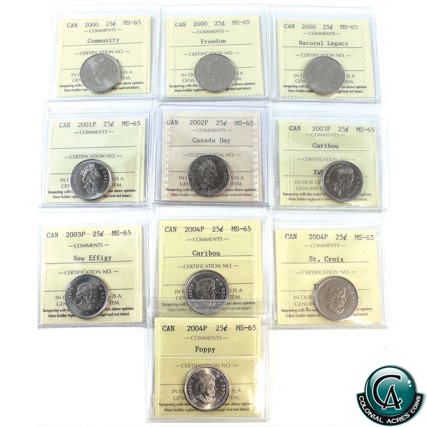25-cent 2000 Community, 2000 Natural Legacy, 2000 Freedom, 2001P, 2002P Canada Day, 2003P New Effigy, 2003P, 2004P, 2004P St. Croix, 2004P Poppy ICCS Certified MS-65. 10pcs.