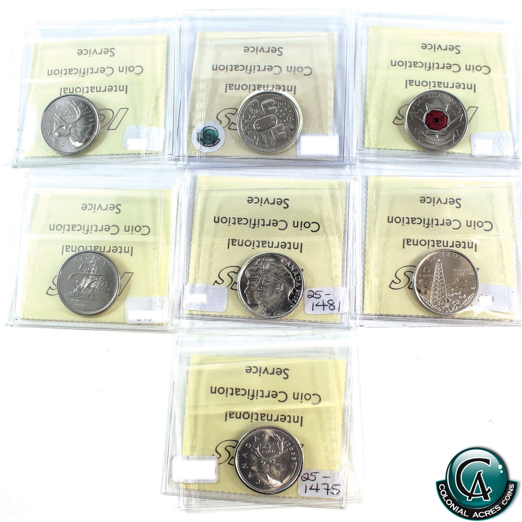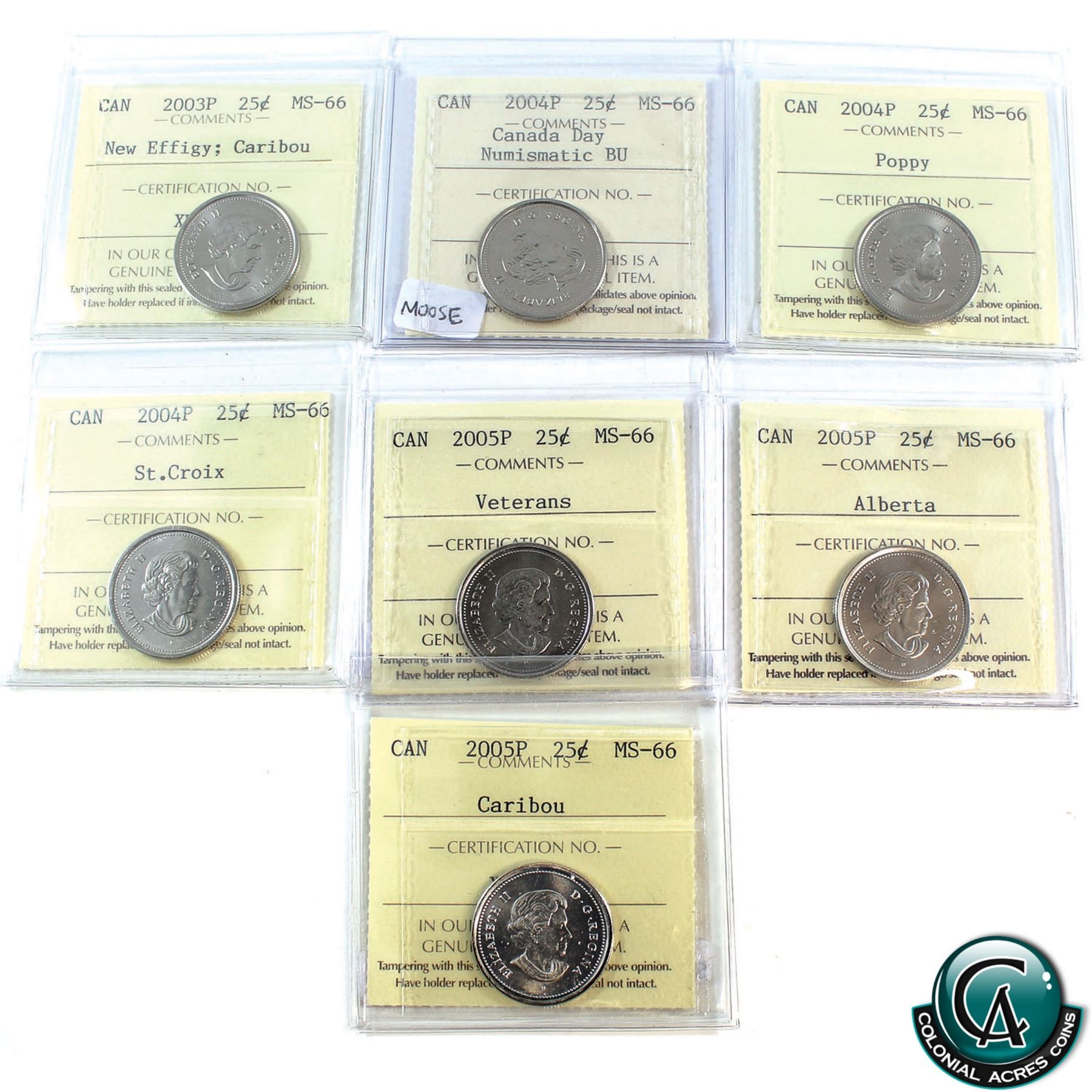 25-cent 2003P New Effigy, 2004P Canada Day NBU, 2004P Poppy, 2004P St. Croix, 2005P Veterans, 2005P Alberta, 2005P ICCS Certified MS-66. 7pcs.