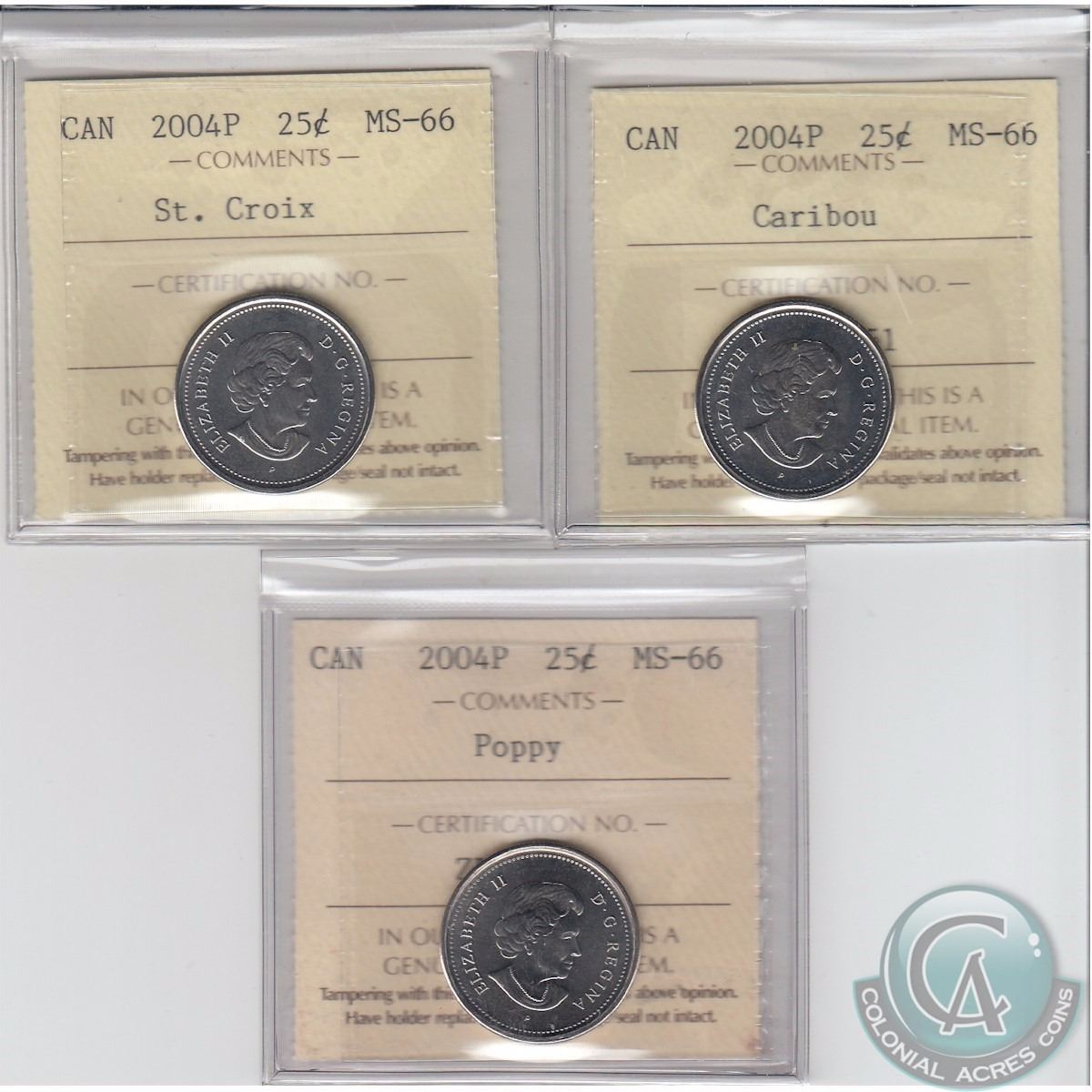 25-cent 2004 P St. Croix, 2004P caribou, 2004P Poppy All ICCS Certified MS-66. 2004 St. Croix & 2004 caribou are both tied for the finest known. 3pcs