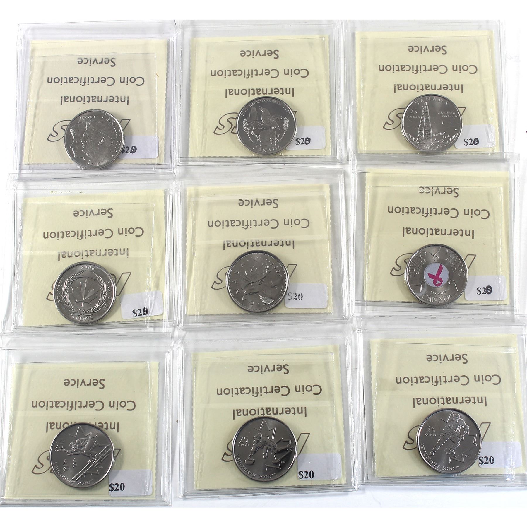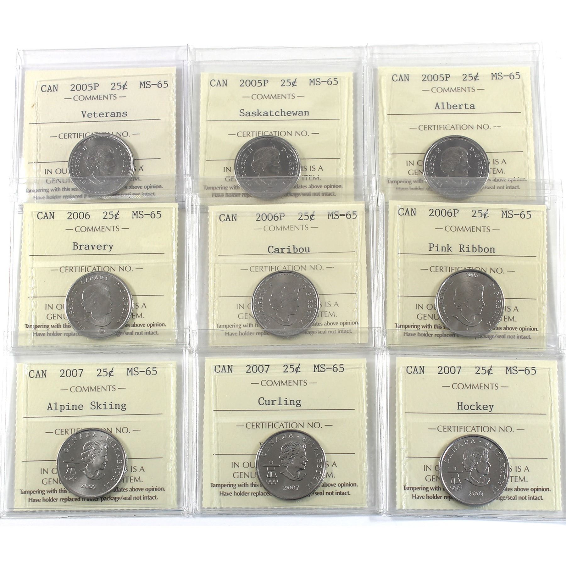 25-cent 2005-2007 ICCS Certified MS-65 - 2005P Veterans, 2005P Saskatchewan, 2005P Alberta, 2006 Bravery, 2006P, 2006P Pink Ribbon, 2007 Alpine Skiing, 2007 Curling & 2007 Hockey. 9pcs